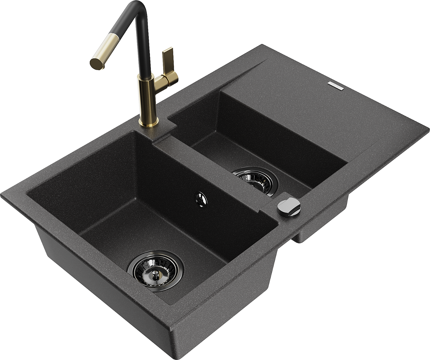 Mexen Gaspar chiuvetă de bucătărie din granit, cu 1,5 cuve și scurgător, și baterie Flora, negru pătat - 6507-76-670401-57-B