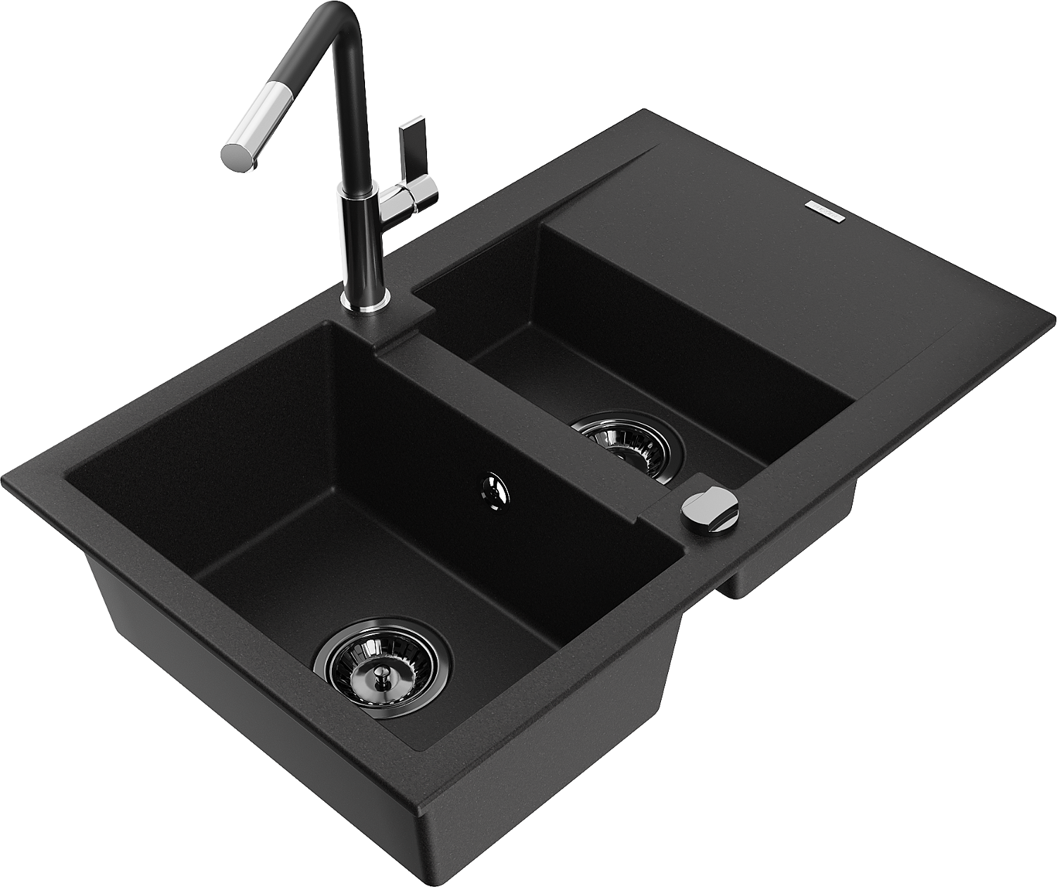 Mexen Gaspar chiuvetă din granit cu 1,5 cuve cu scurgător și baterie de bucătărie Flora, negru - 6507-77-670401-07-B