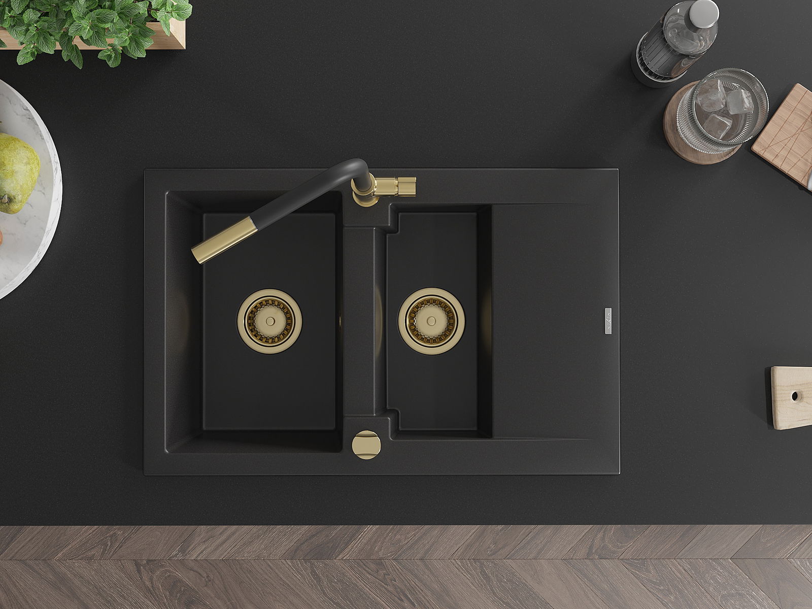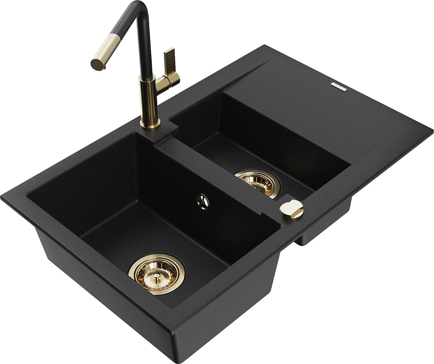 Mexen Gaspar chiuvetă de bucătărie din granit, 1,5 cuve cu scurgător și baterie Flora, negru - 6507-77-670401-57-G