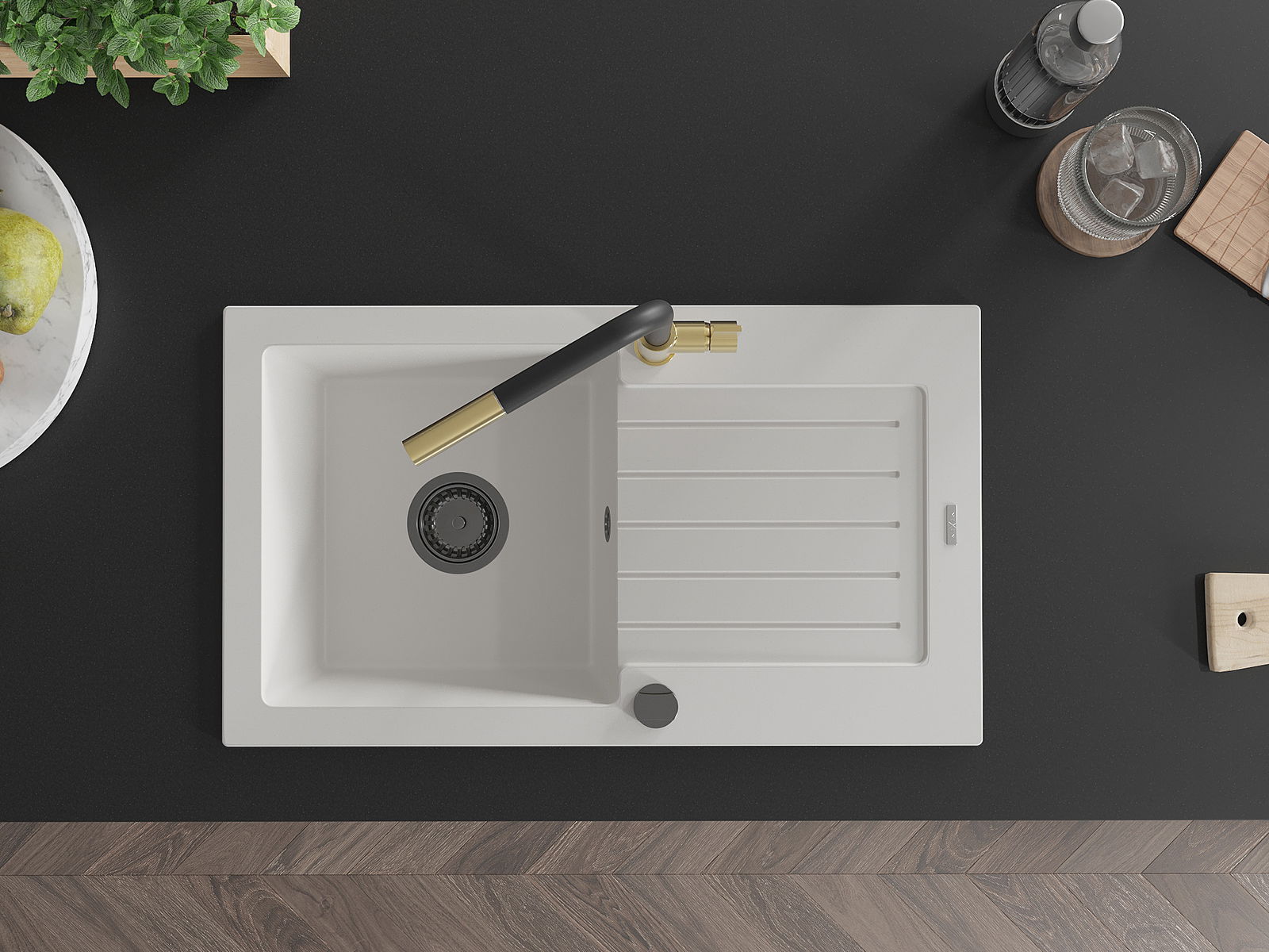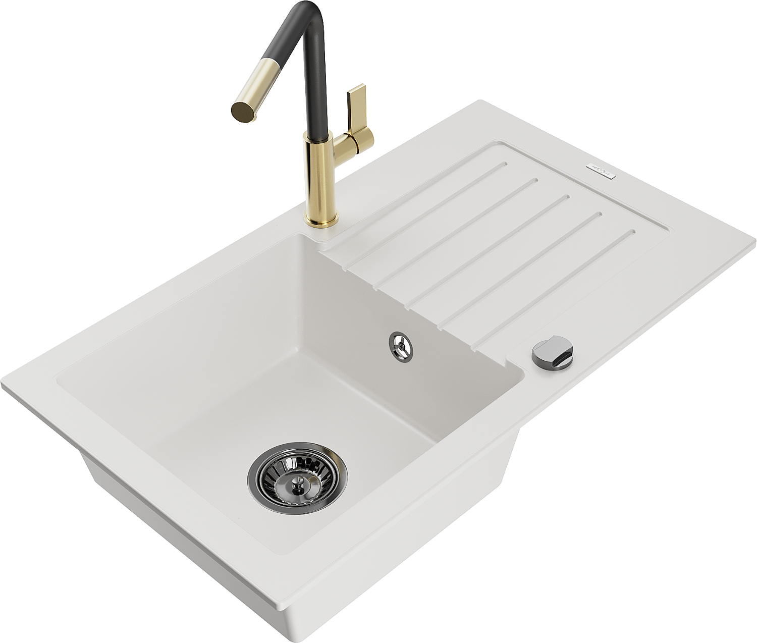 Mexen Pablo chiuvetă de bucătărie din granit cu 1 compartiment și scurgător și baterie de bucătărie Flora, alb - 6510-20-670401?