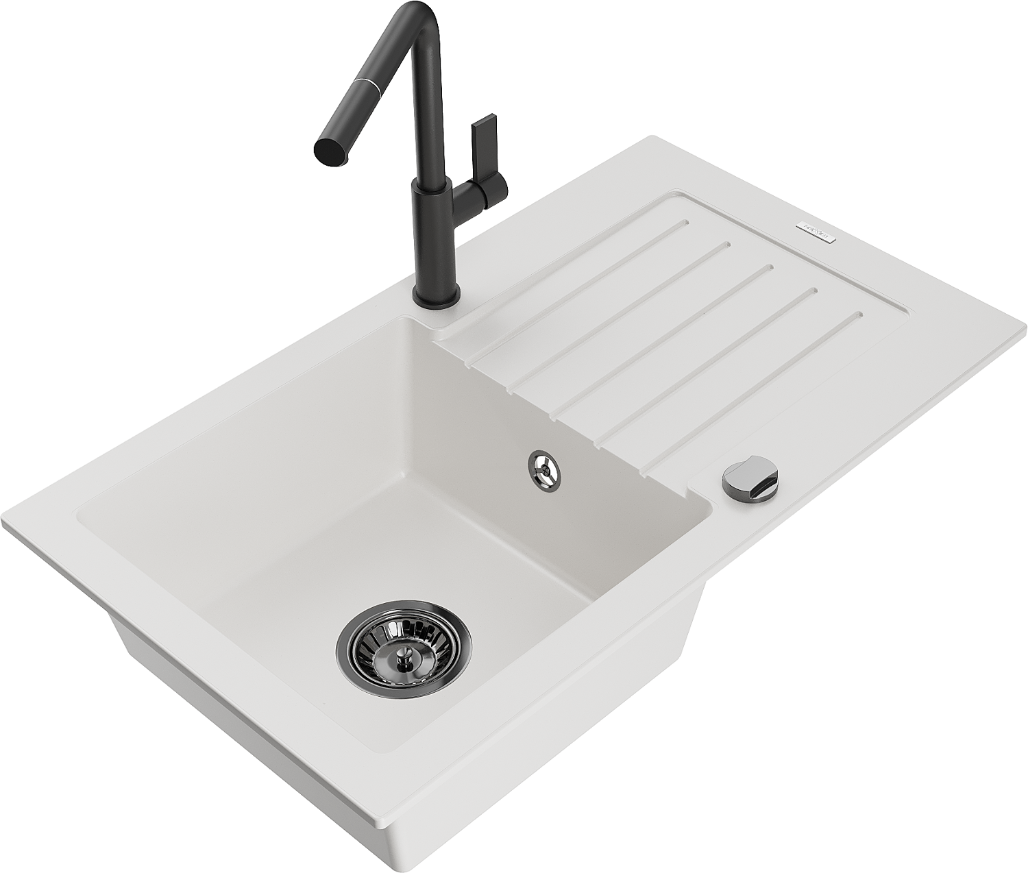Mexen Pablo chiuvetă de bucătărie din granit cu 1 compartiment, cu scurgător și baterie Flora, albă - 6510-20-670401-70-B