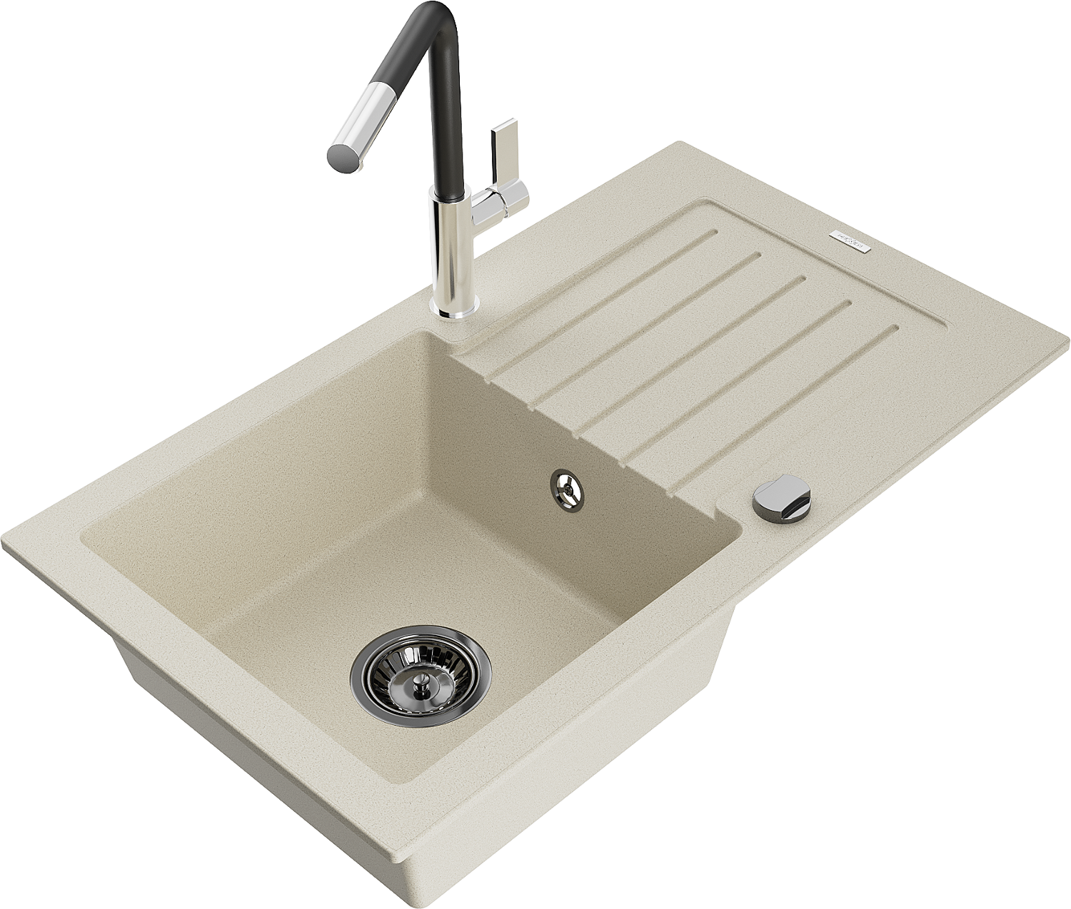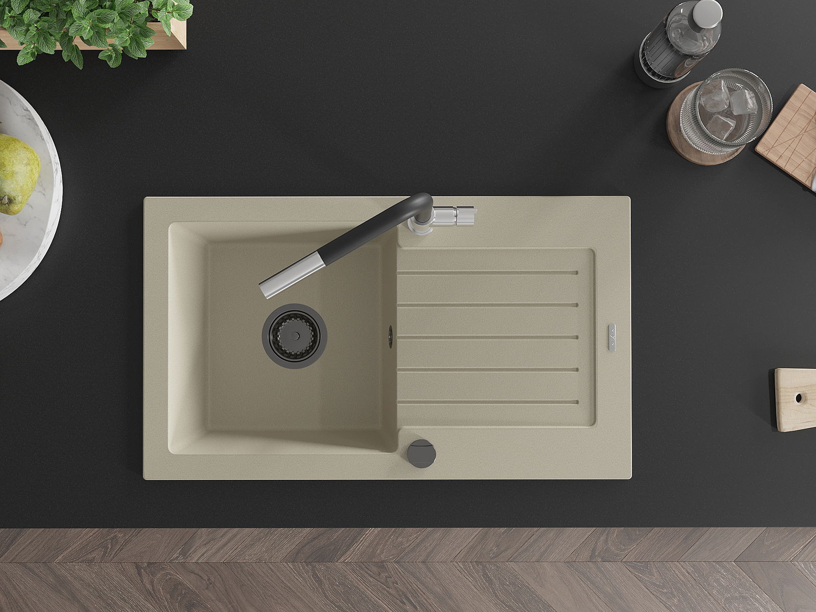 Mexen Pablo chiuvetă din granit cu o singură cuvă și scurgător și baterie de bucătărie Flora, bej - 6510-69-670401-07-B