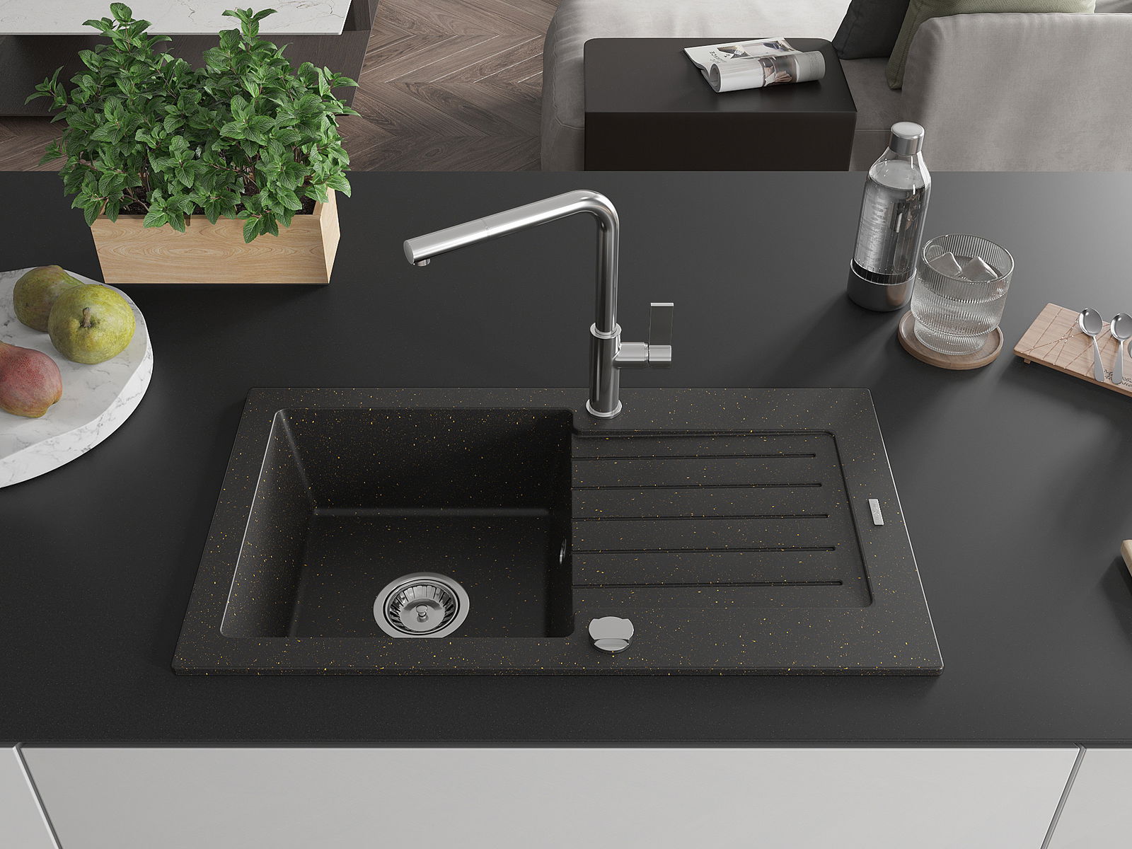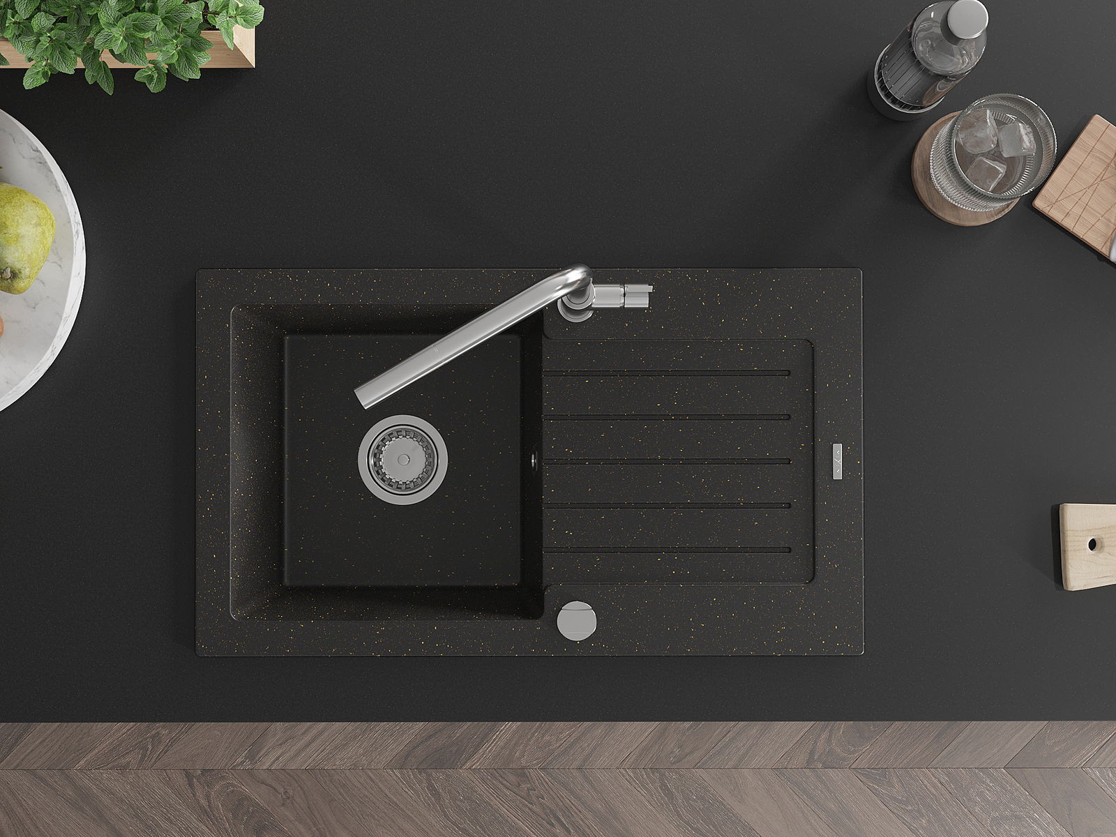 Suprafața chiuvetei este rezistentă la pete și decolorare, ceea ce o face ușor de întreținut și își păstrează culoarea pentru o perioadă lungă de utilizare. Un complet estetic și practic pentru orice bucătărie.