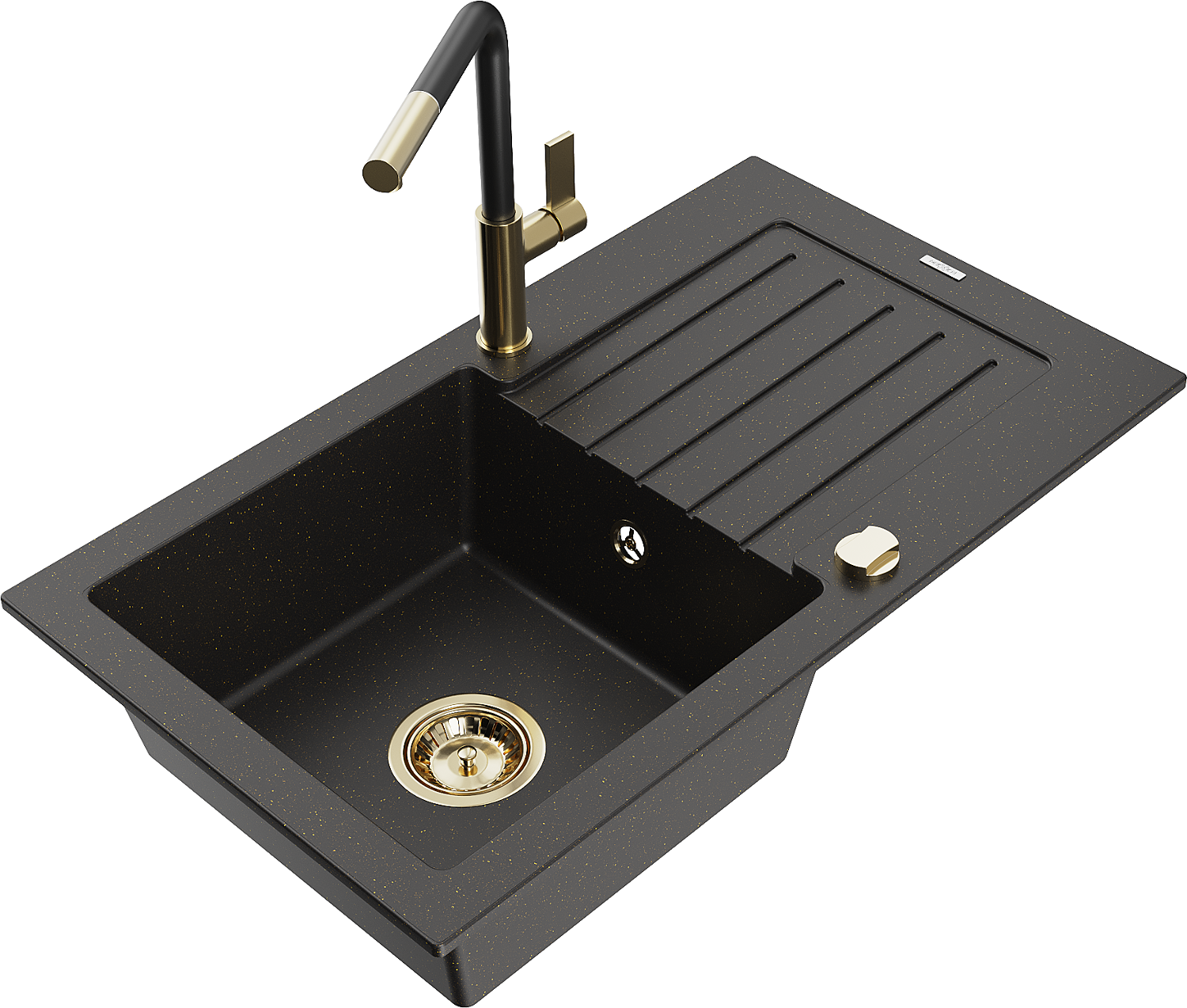 Mexen Pablo chiuvetă de bucătărie din granit cu 1 compartiment cu scurgător și baterie Flora, negru/auriu metalizat - 6510-75-6?