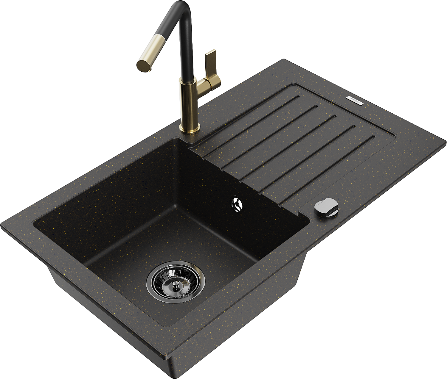 Mexen Pablo chiuvetă de granit cu o cuvă și scurgător, cu baterie de bucătărie Flora, negru/auriu metalizat