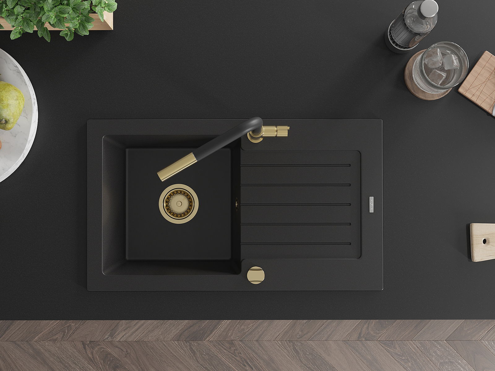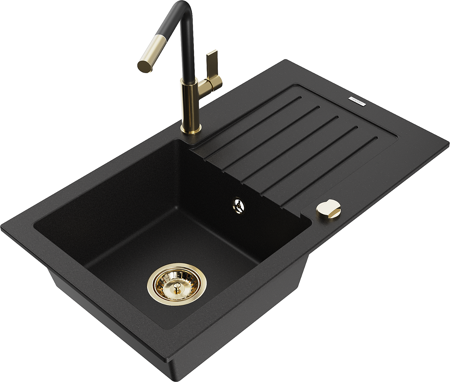 Mexen Pablo chiuvetă de bucătărie din granit cu 1 compartiment și scurgător și baterie Flora, negru - 6510-77-670401-57-G