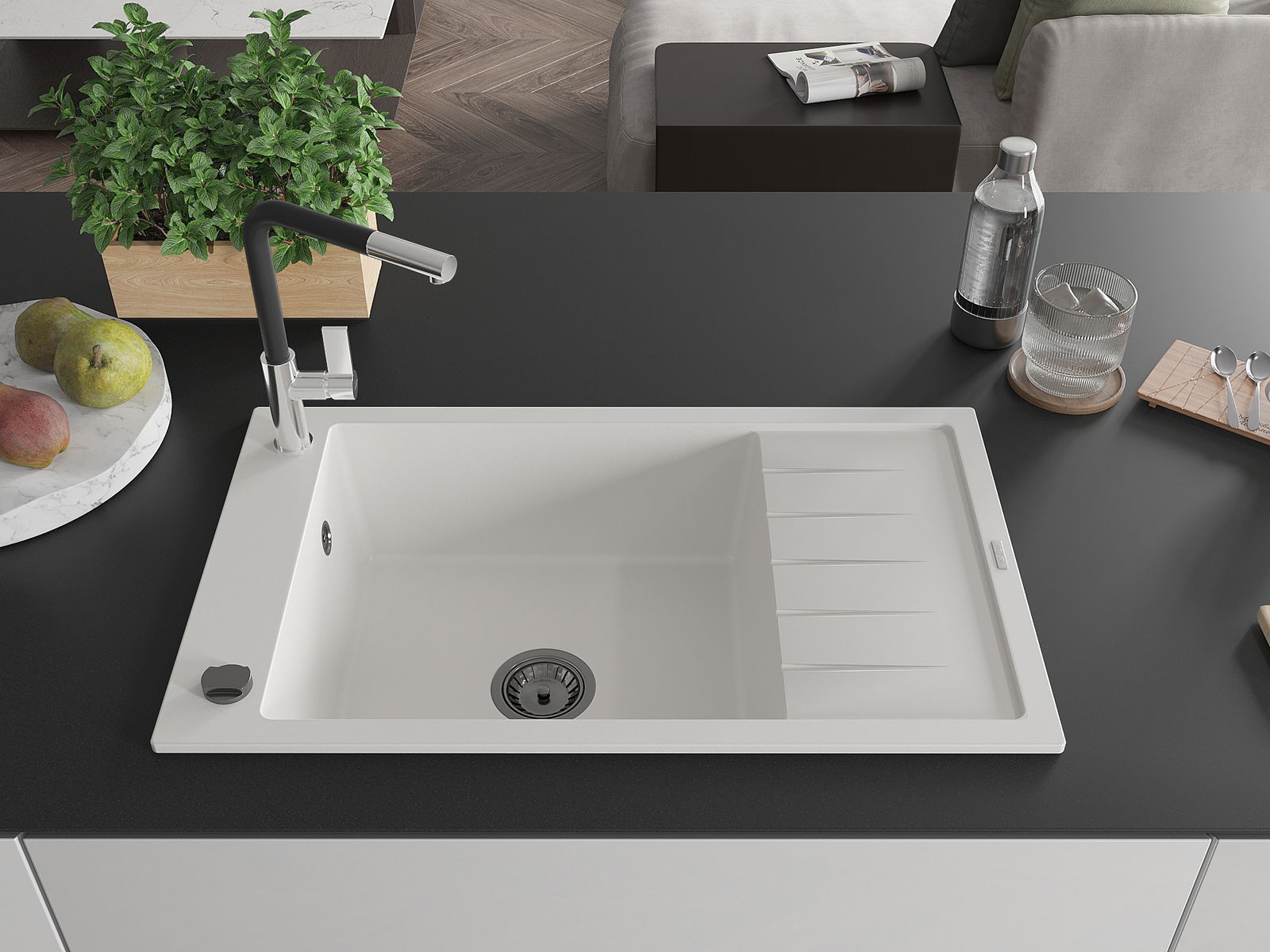 Suprafața chiuvetei este rezistentă la pete și decolorarea, datorită căreia este ușor de curățat și își păstrează culoarea mult timp. Estetică și practic completarea fiecărei bucătării.