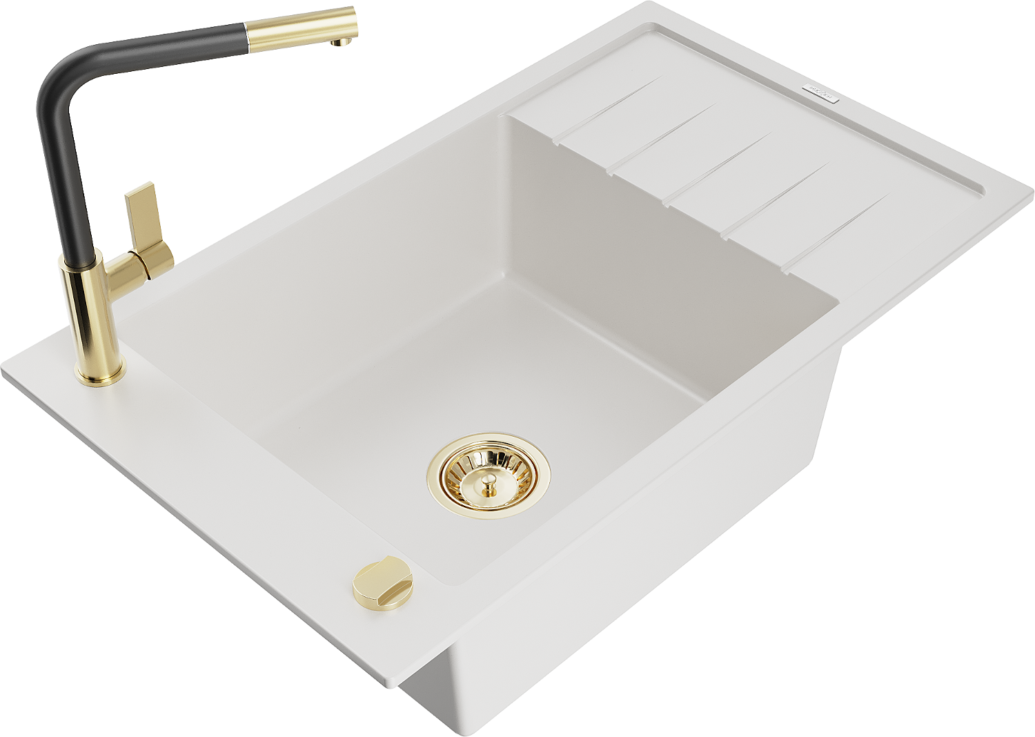 Mexen Elias chiuvetă de granit cu 1 compartiment cu picurător și baterie de bucătărie Flora, alb - 6511-20-670401-57-G