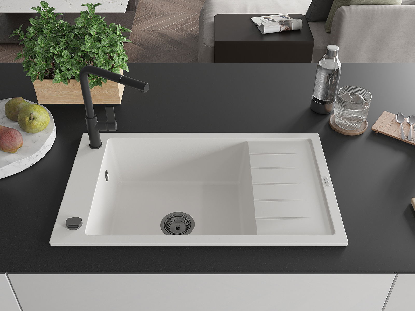 Suprafața chiuvetei este rezistentă la pete și decolorarea, datorită căreia este ușor de curățat și își păstrează culoarea mult timp. Estetică și practic completarea fiecărei bucătării.