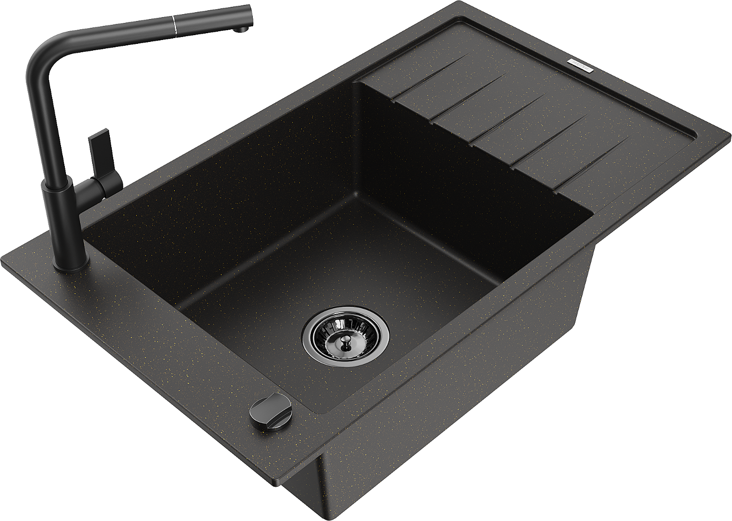 Mexen Elias chiuvetă granit 1-cameră cu scurgător și baterie de bucătărie Flora, negru/auriu metalic - 6511-75-670401-70-B