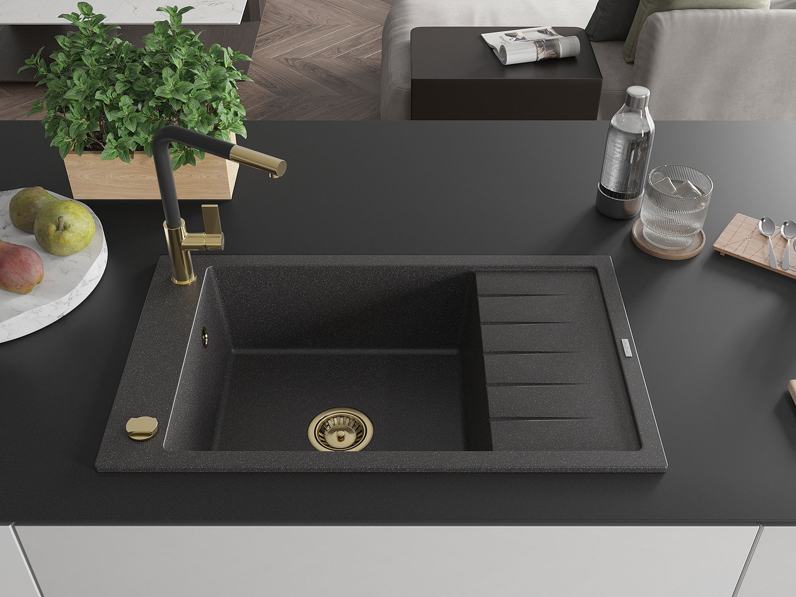 Mexen Elias chiuvetă de granit cu o singură cuvă, cu scurgător și robinet de bucătărie Flora, negru stropit