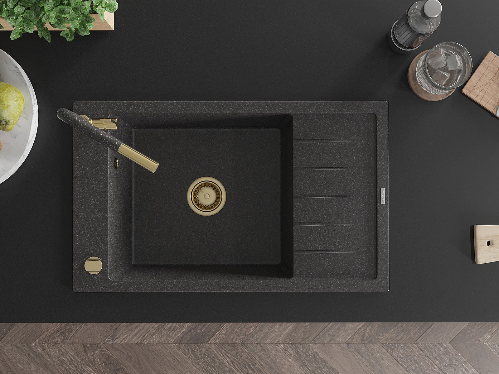 Mexen Elias chiuvetă de granit cu o singură cuvă cu scurgător și baterie pentru bucătărie Flora, neagră cu stropi