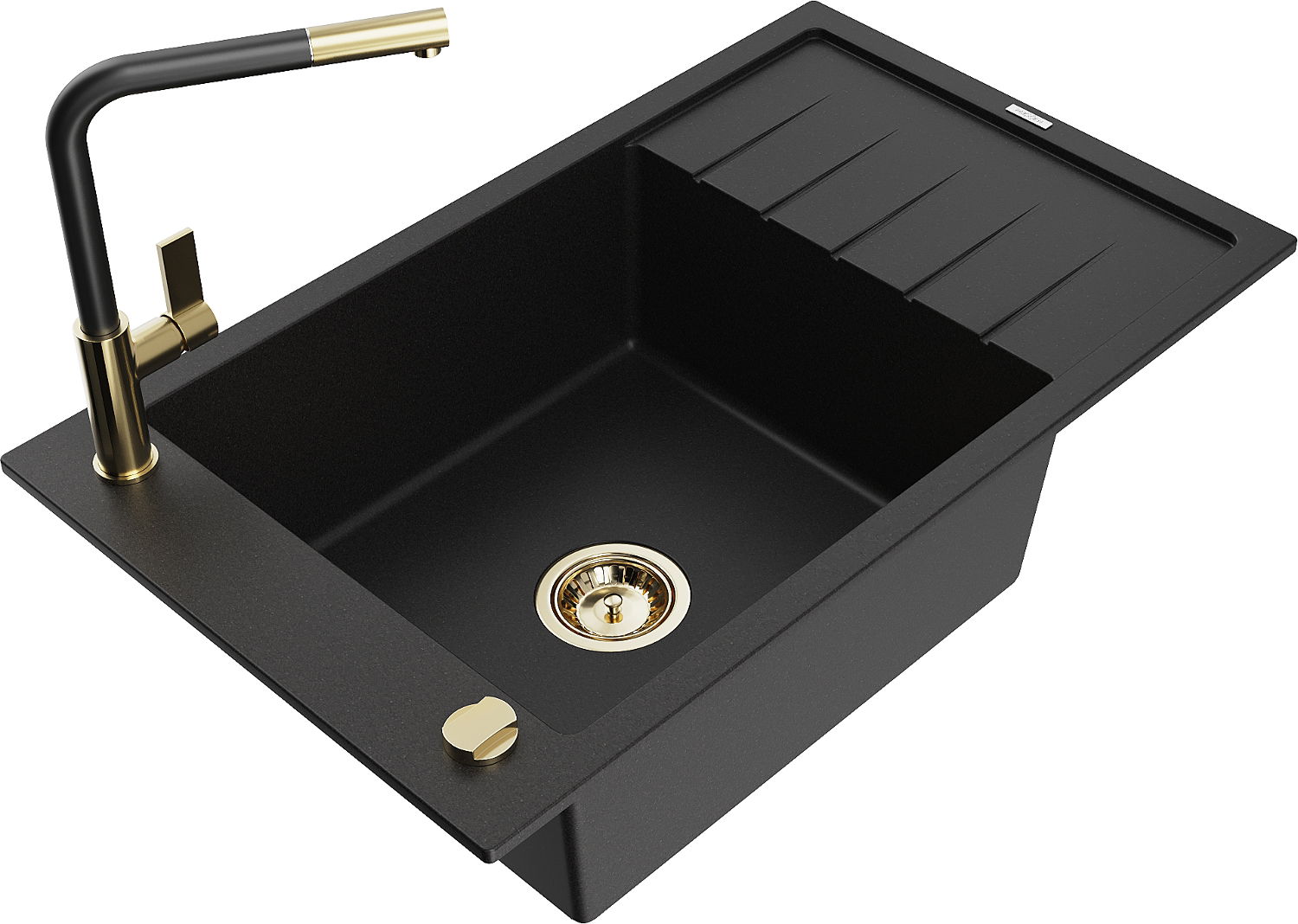 Mexen Elias chiuvetă de granit cu 1 compartiment, cu scurgător și baterie de bucătărie Flora, negru - 6511-77-670401-57-G