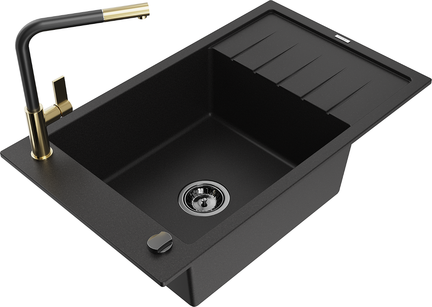 Mexen Elias chiuvetă de bucătărie din granit cu 1 cameră și picurător și baterie Flora, negru - 6511-77-670401-57-B