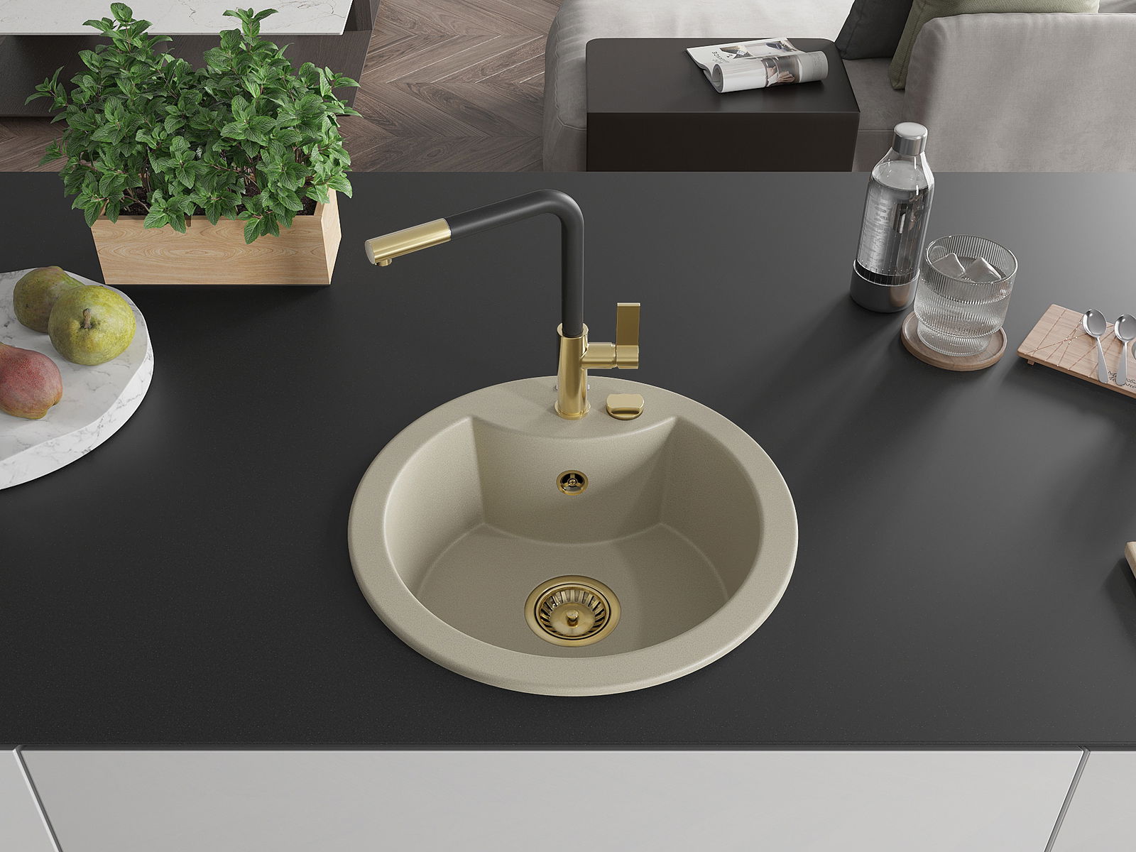 Mexen Diego chiuvetă de granit cu 1 compartiment cu baterie de bucătărie Flora, bej - 6512-69-670401-57-G