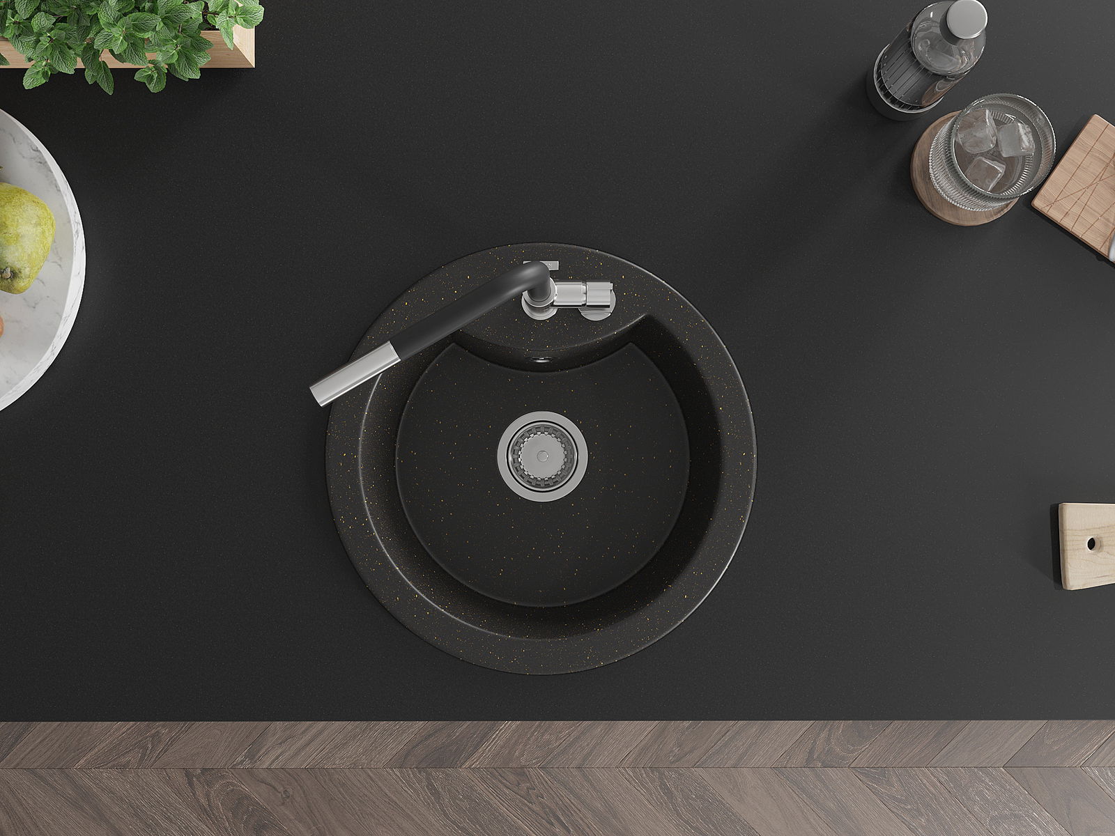 Mexen Diego chiuvetă din granit cu 1 compartiment cu baterie de bucătărie Flora, negru/auriu metalizat - 6512-75-670401-07