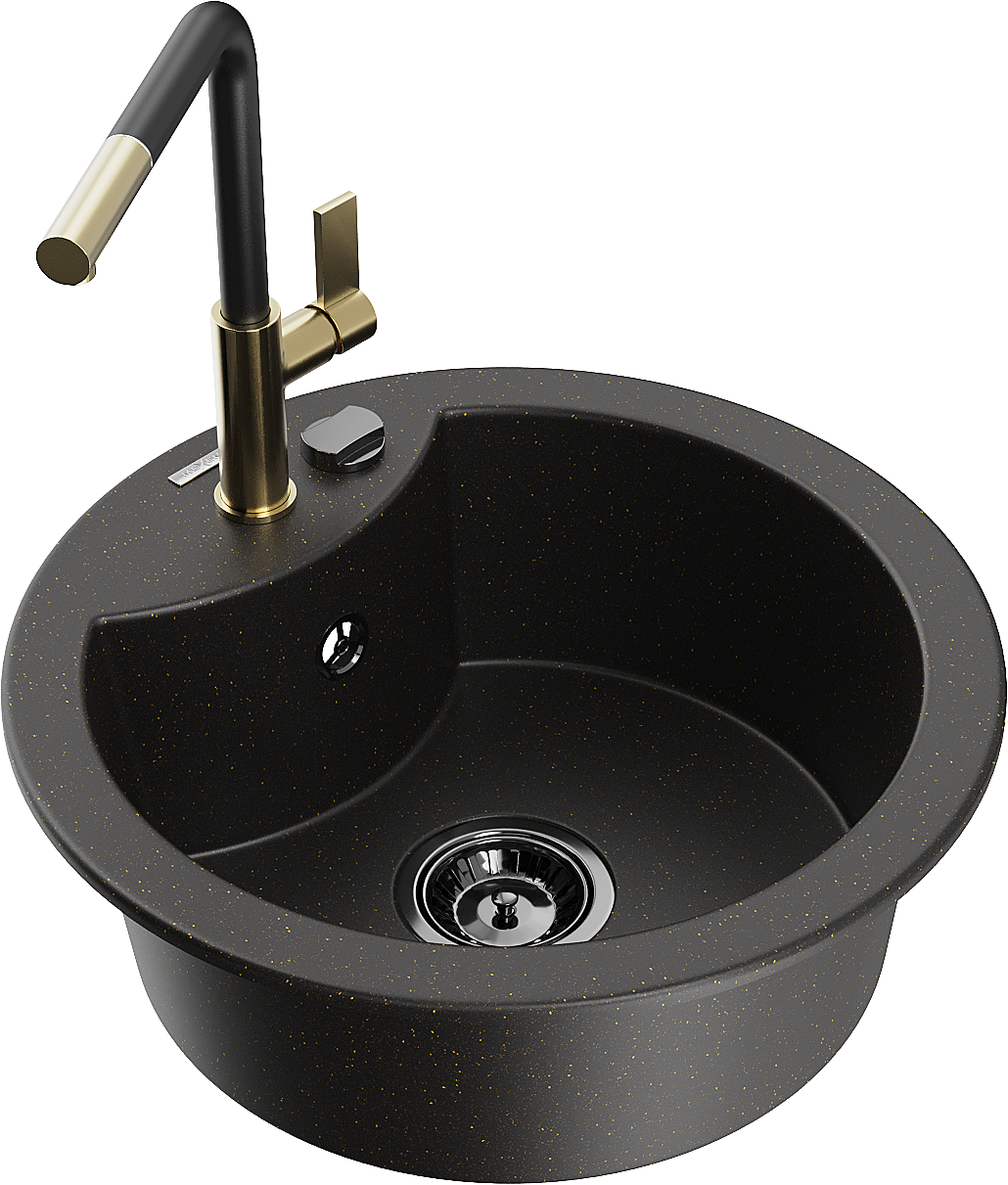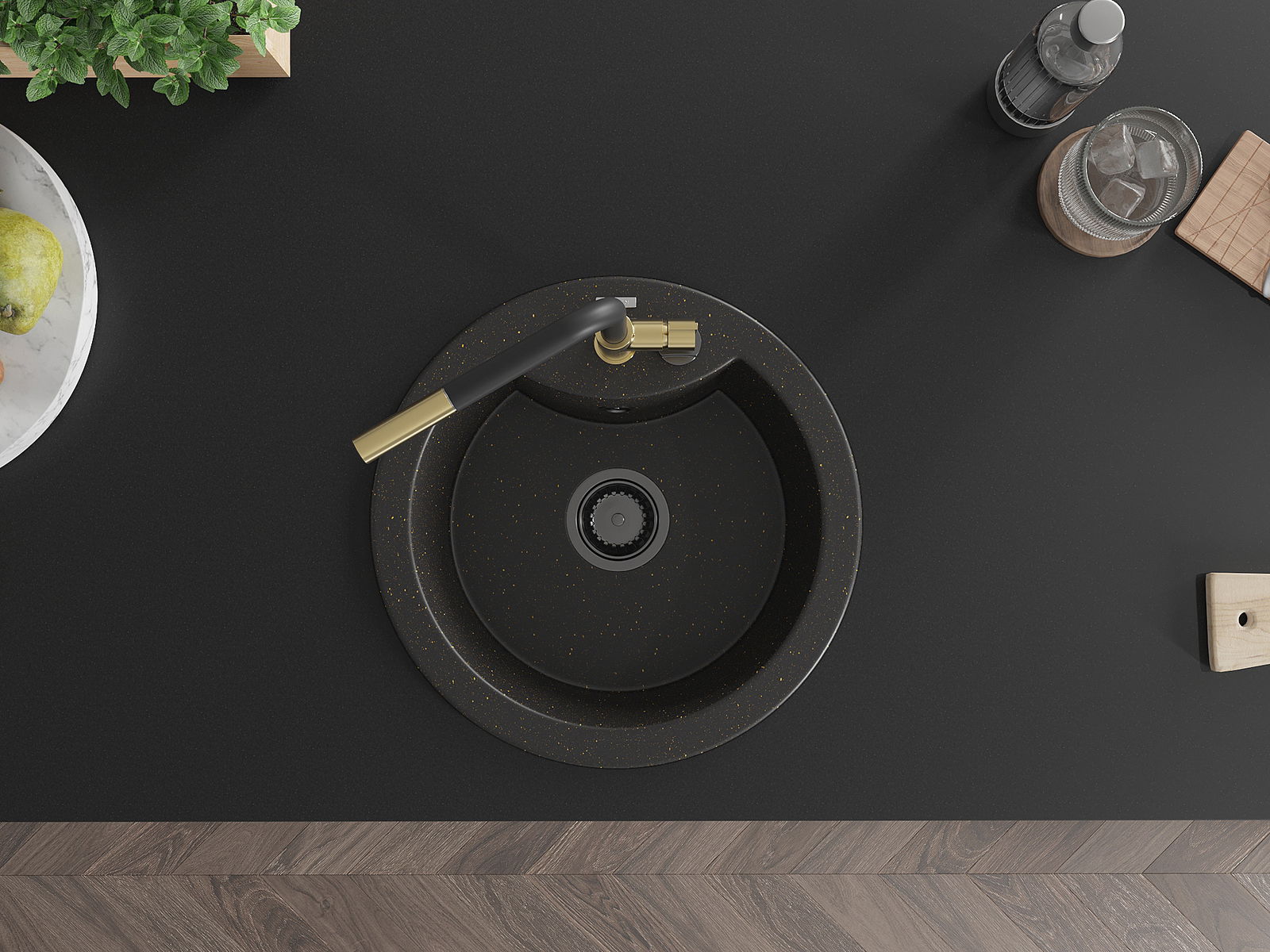 Mexen Diego chiuvetă de granit cu 1 compartiment cu baterie de bucătărie Flora, negru/auriu metalic - 6512-75-670401-57-B