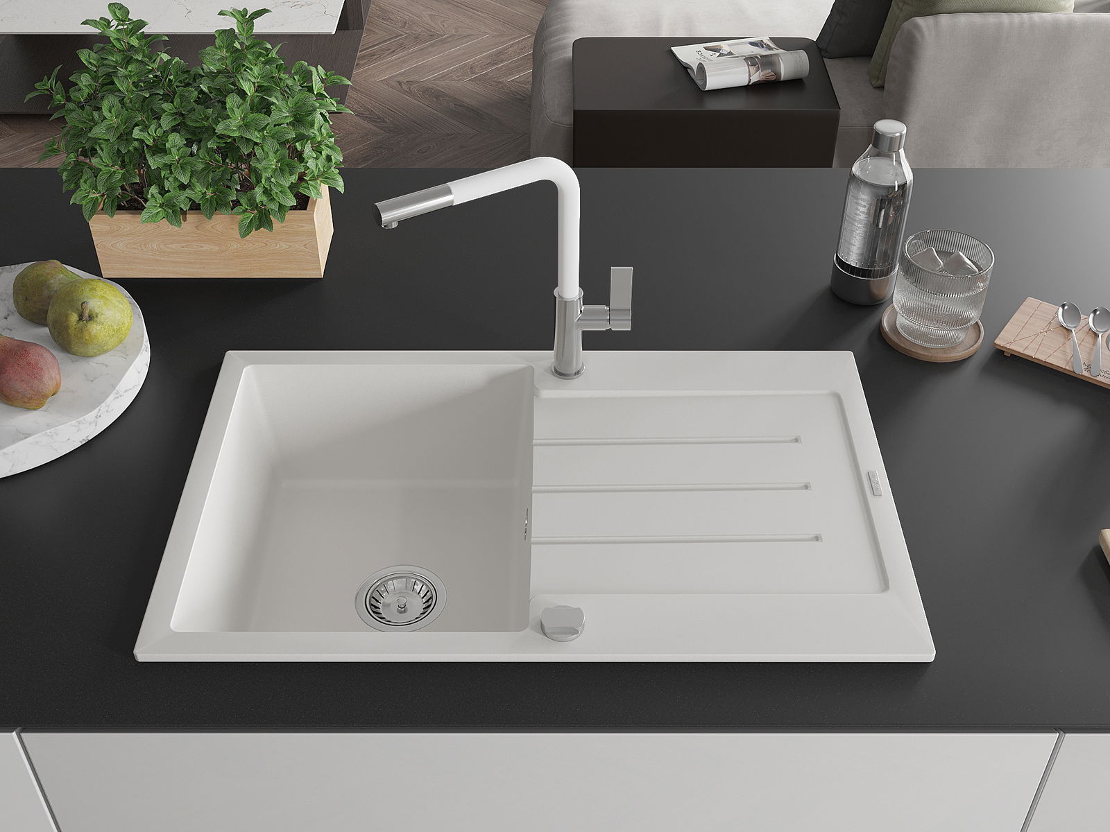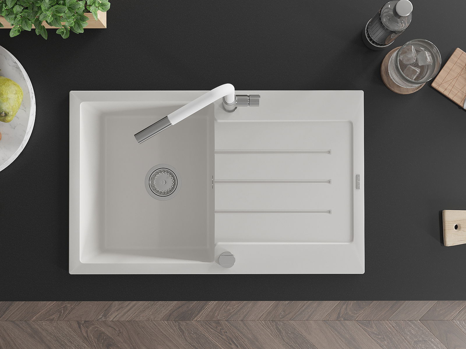 Mexen Bruno chiuvetă de granit cu 1 compartiment cu scurgător și baterie de bucătărie Flora, alb - 6513-20-670401-02