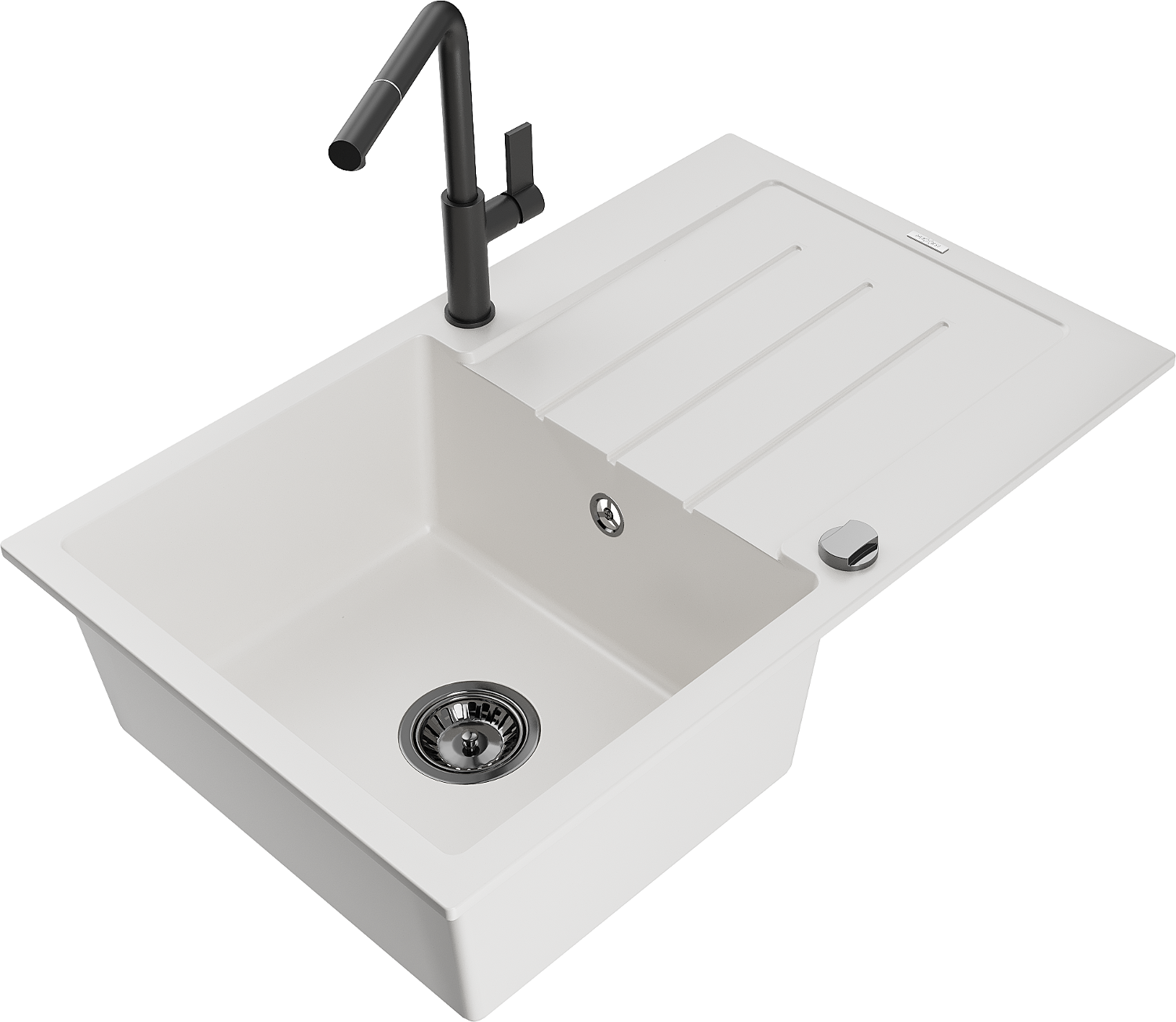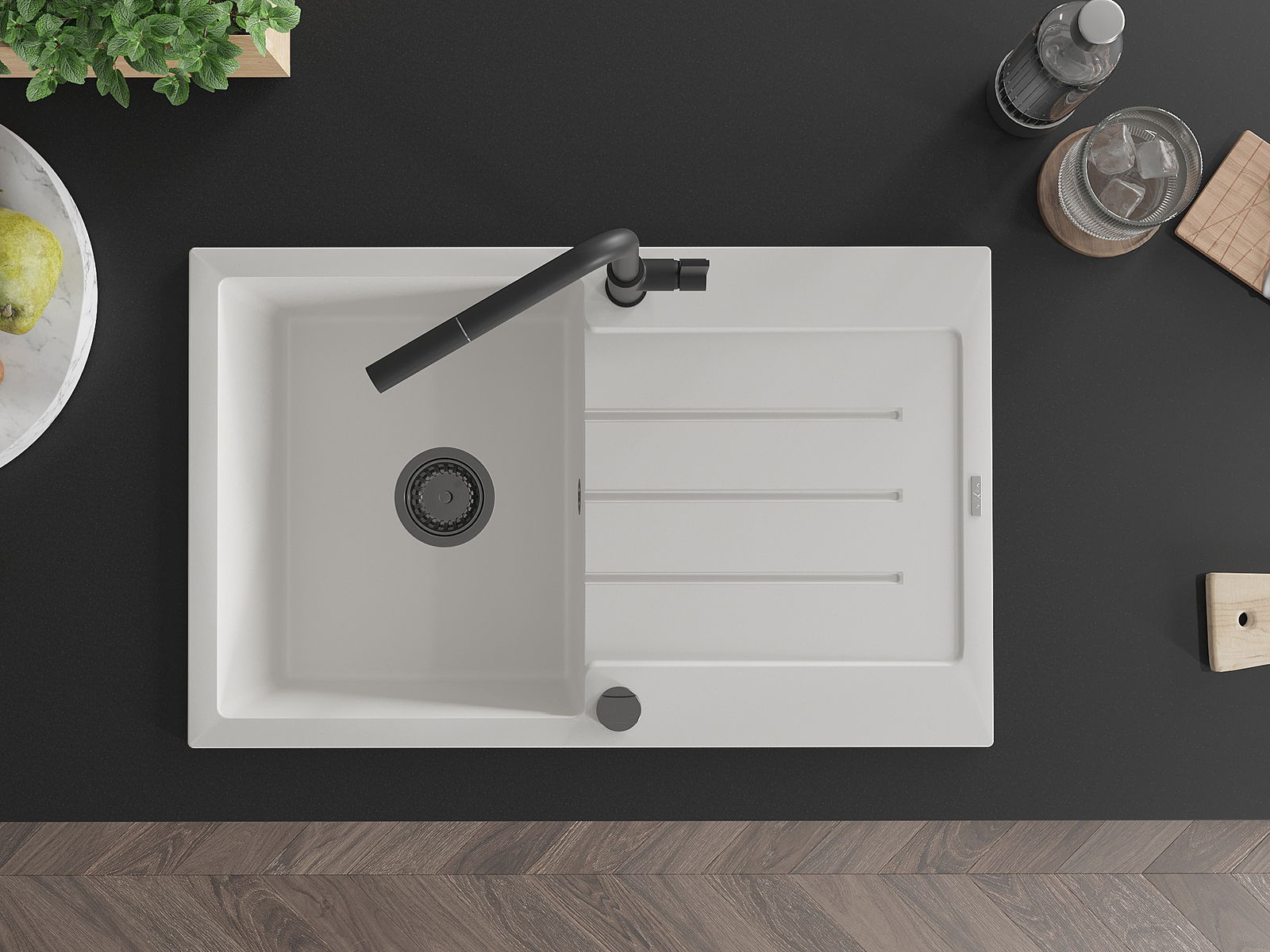 Mexen Bruno chiuvetă de bucătărie din granit cu 1 vas, cu scurgător și baterie Flora, albă - 6513-20-670401-70-B