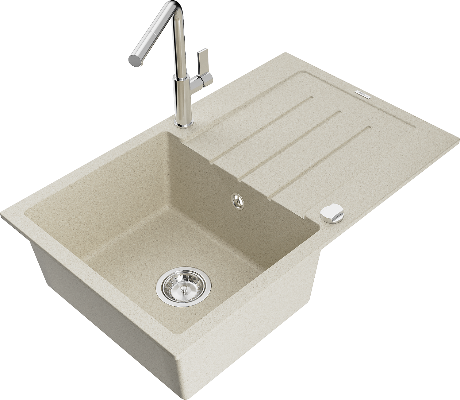 Mexen Bruno chiuvetă de bucătărie din granit cu 1 compartiment și scurgător și baterie Flora, bej - 6513-69-670401-00