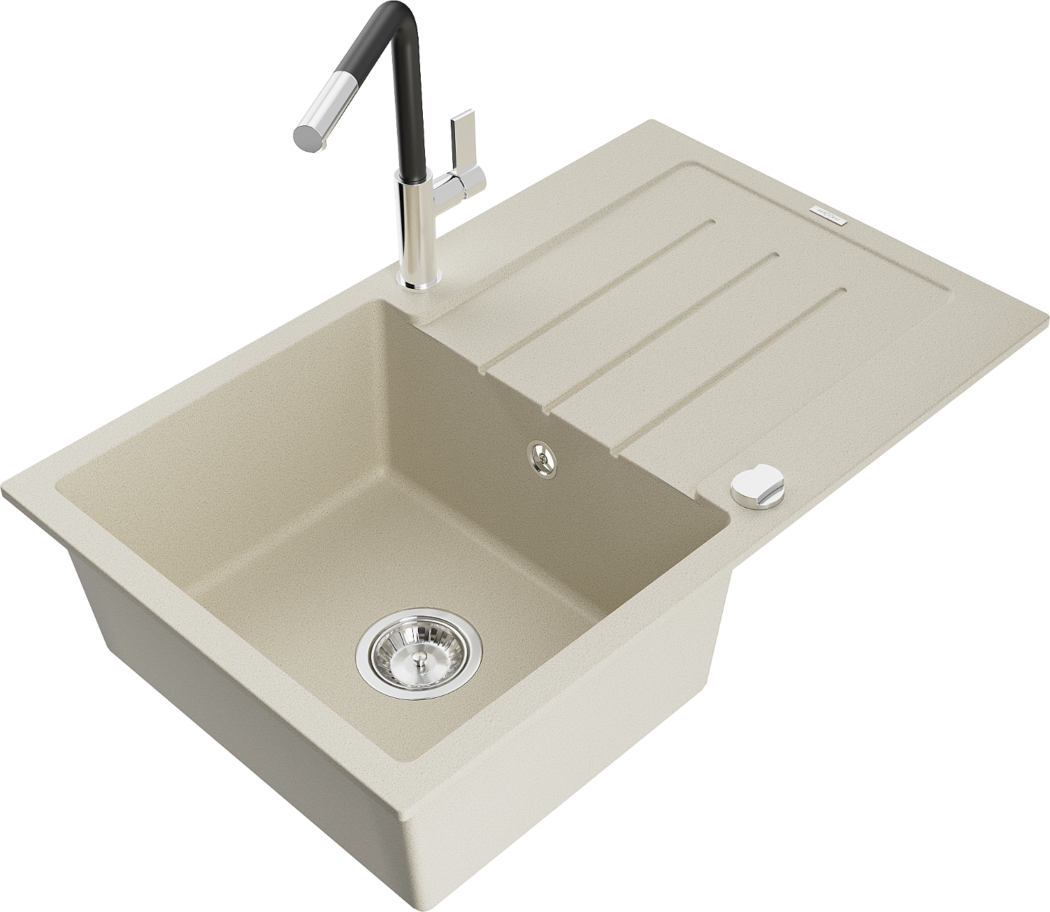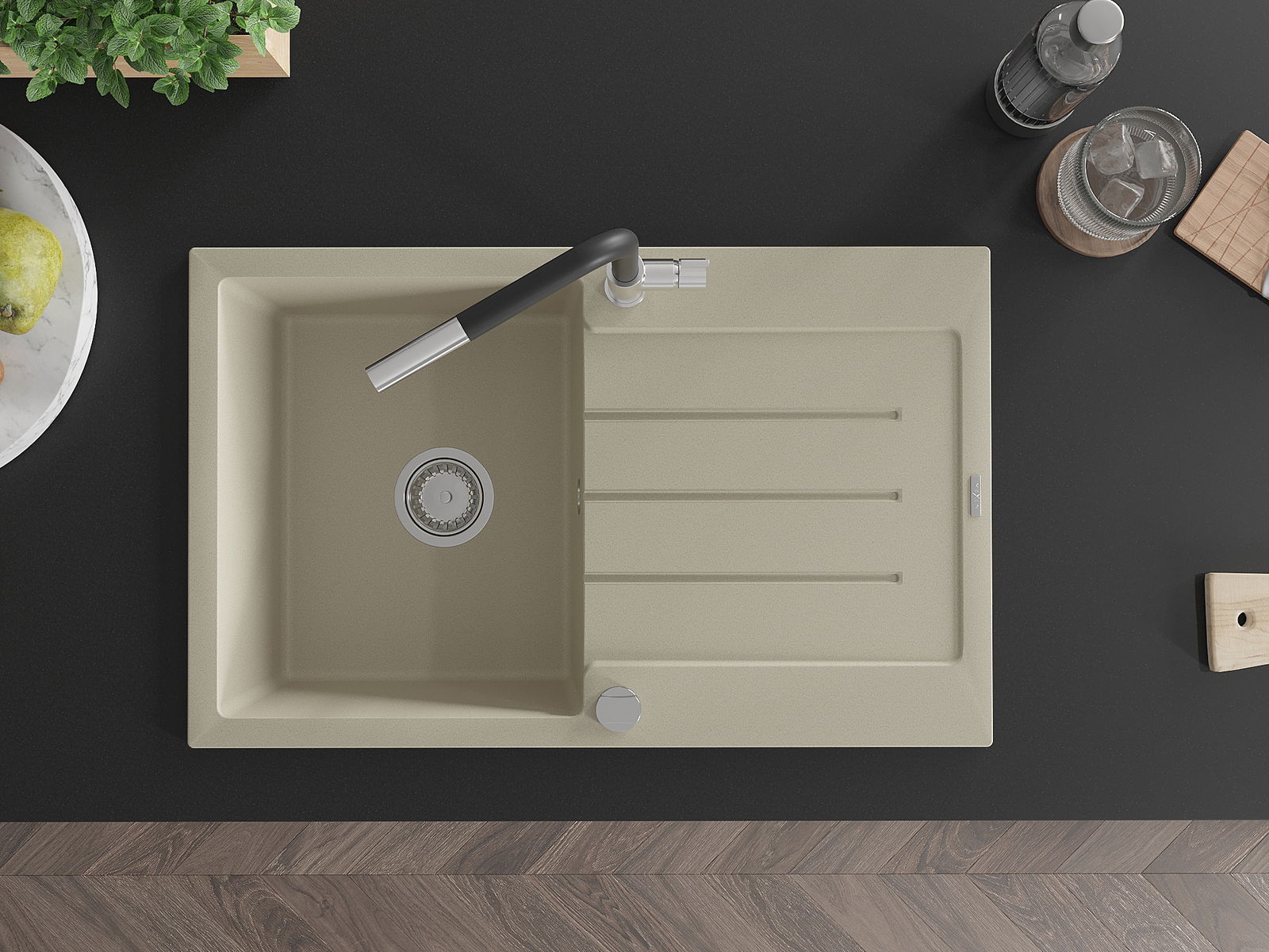 Mexen Bruno chiuvetă de granit cu 1 compartiment, cu picurător și baterie de bucătărie Flora, bej - 6513-69-670401-07