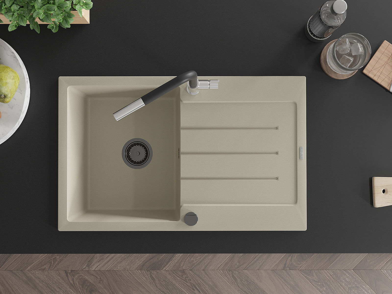Suprafața chiuvetei este rezistentă la pete și decolorarea, datorită căreia este ușor de curățat și își păstrează culoarea mult timp. Estetică și practic completarea fiecărei bucătării.