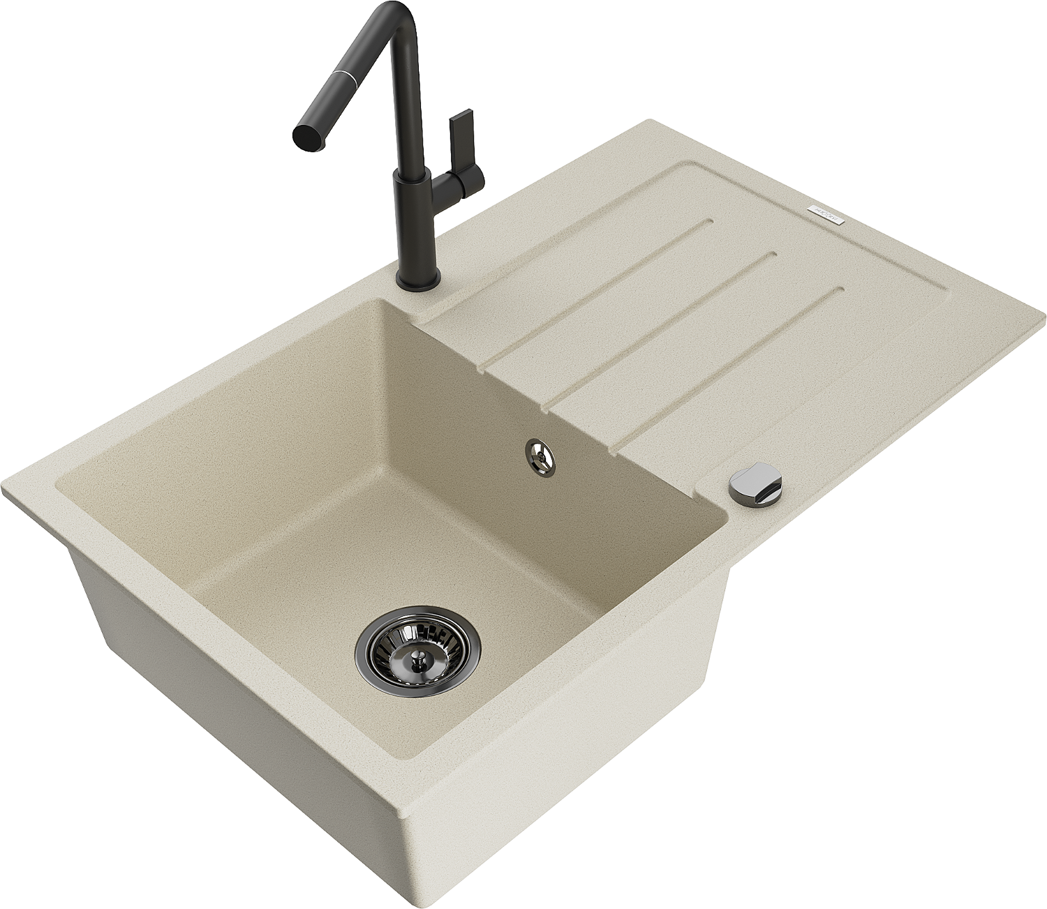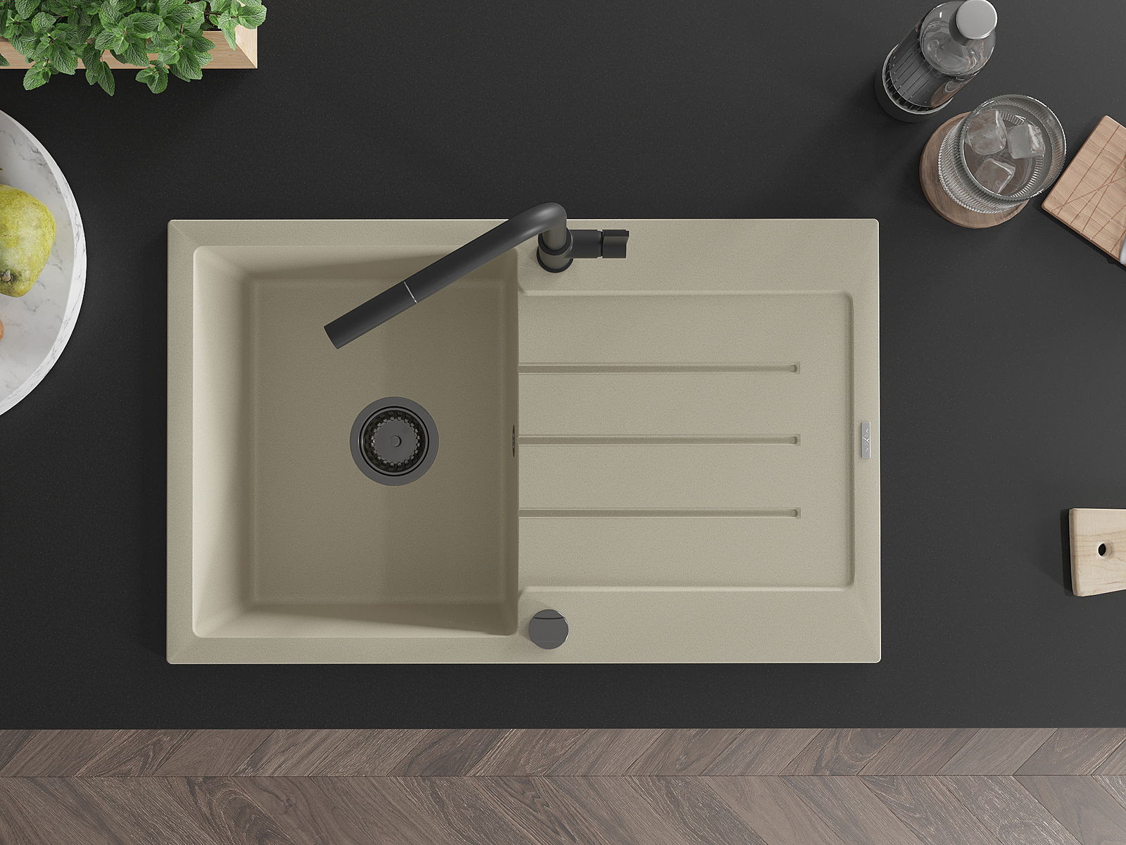 Mexen Bruno chiuvetă de granit cu 1 compartiment cu picurător și baterie de bucătărie Flora, bej - 6513-69-670401-70-B