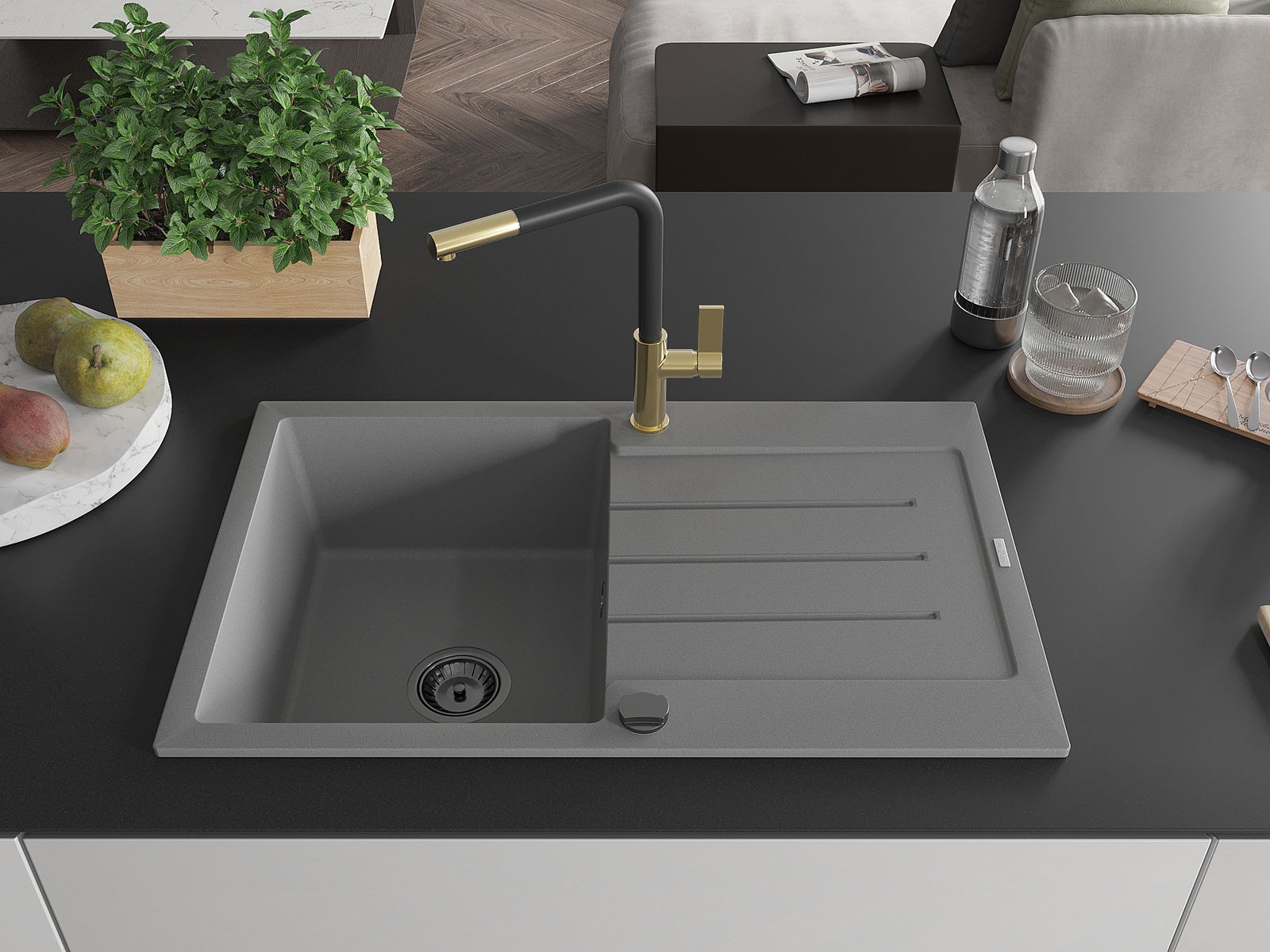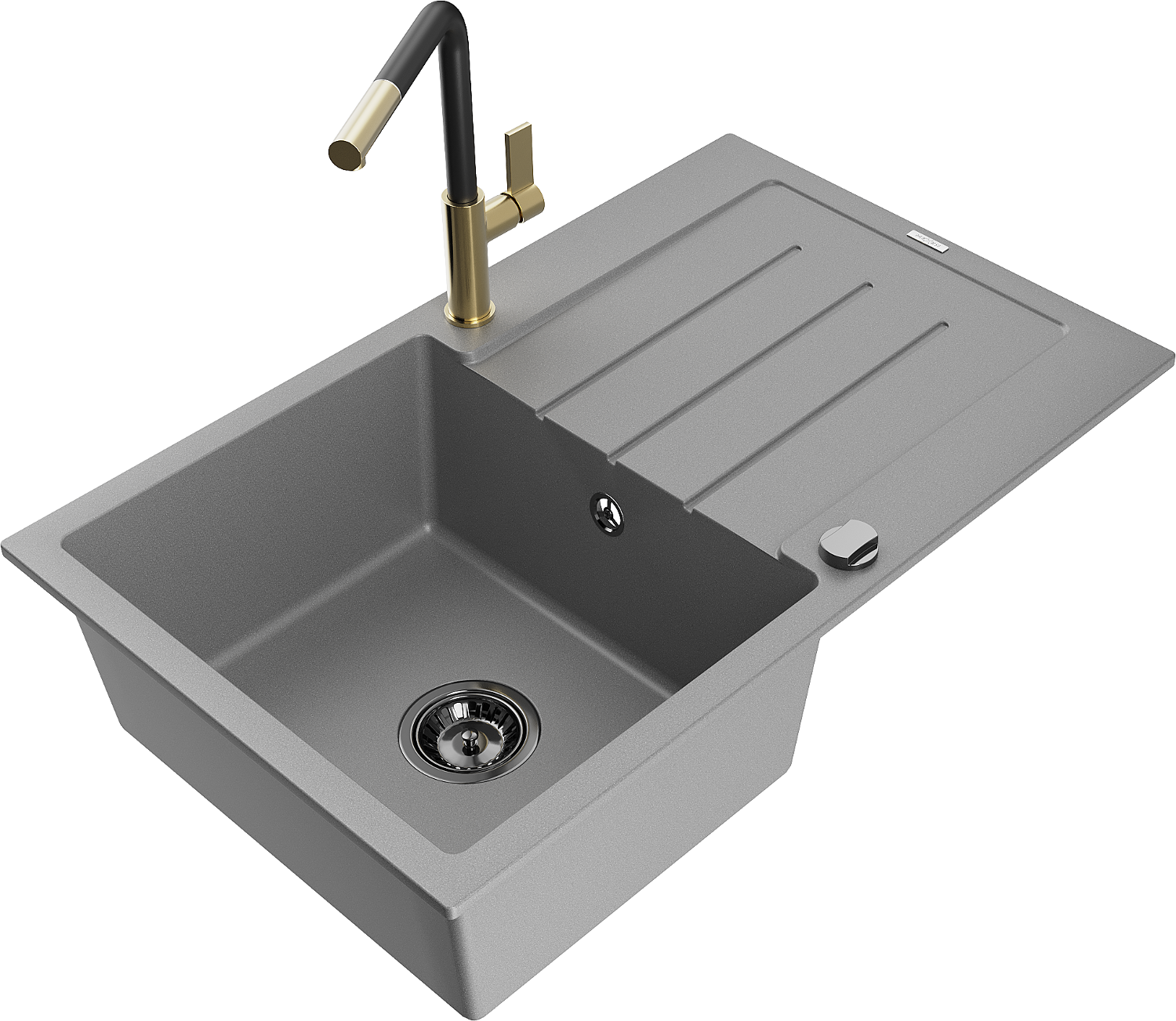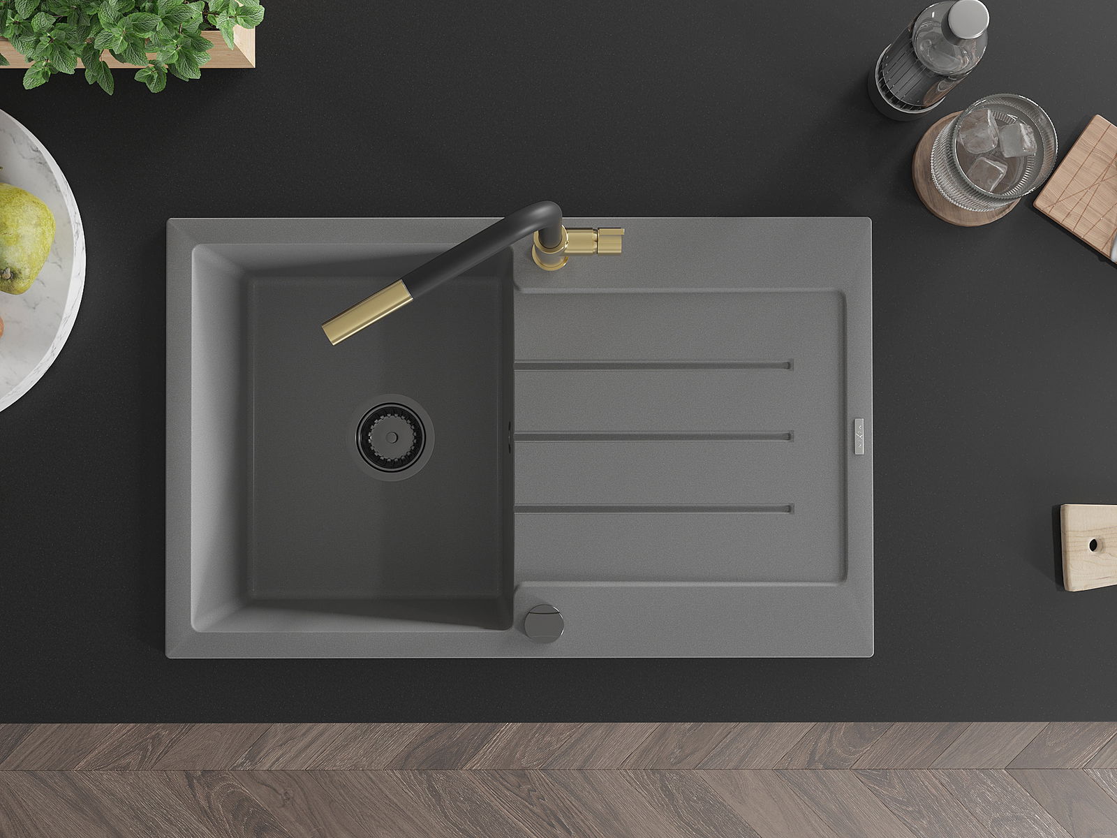 Mexen Bruno chiuvetă de granit cu 1 compartiment și scurgător, cu baterie Flora, gri - 6513-71-670401-57-B