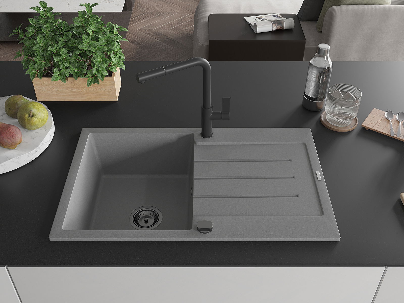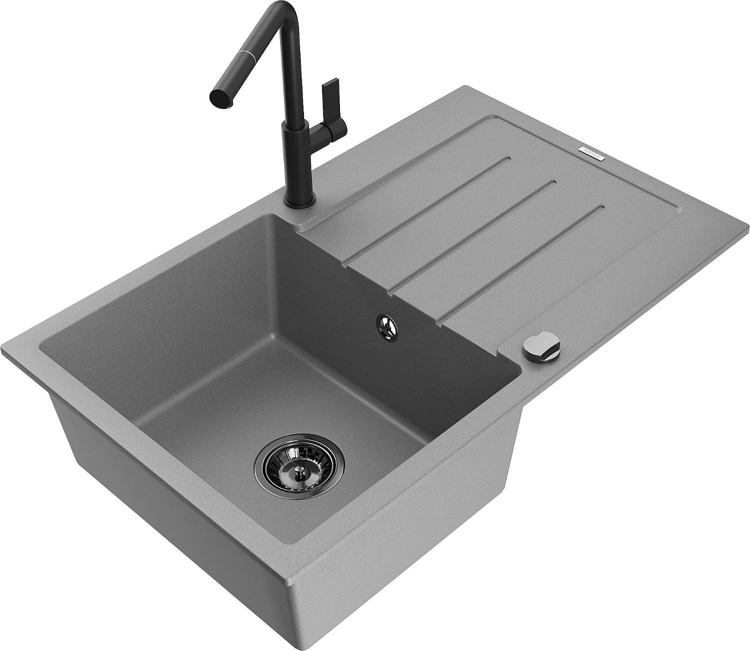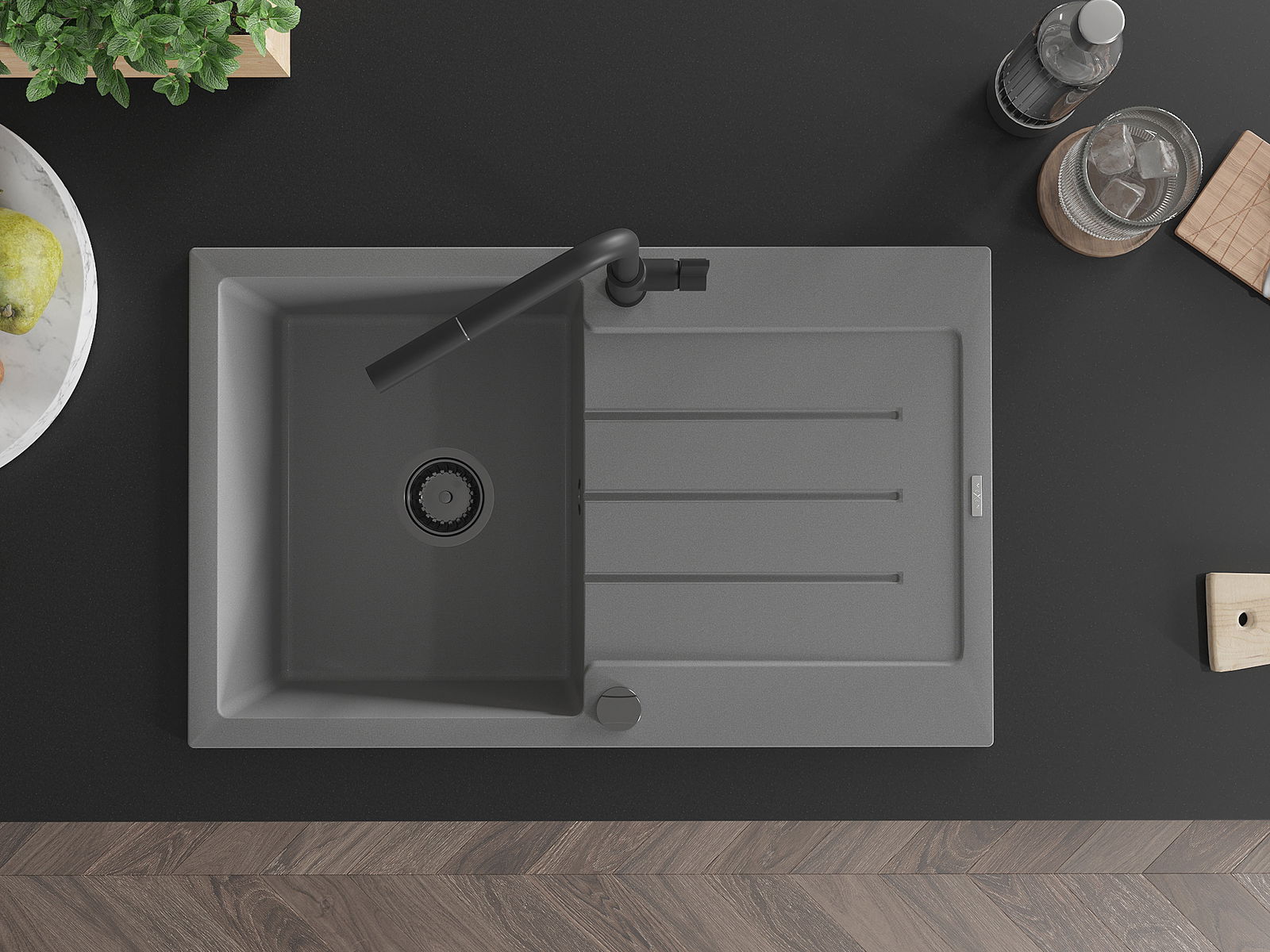 Mexen Bruno chiuvetă de bucătărie din granit cu 1 compartiment cu scurgător și baterie Flora, gri - 6513-71-670401-70-B