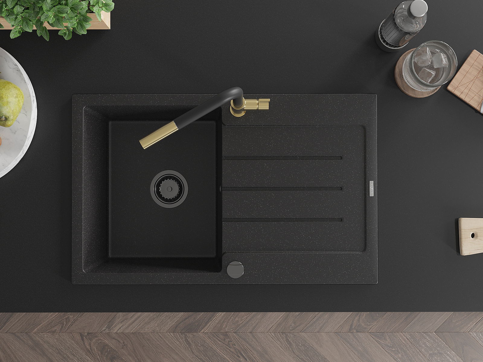 Mexen Bruno chiuvetă din granit cu 1 compartiment, cu scurgător și baterie de bucătărie Flora, negru\/argintiu metalizat
