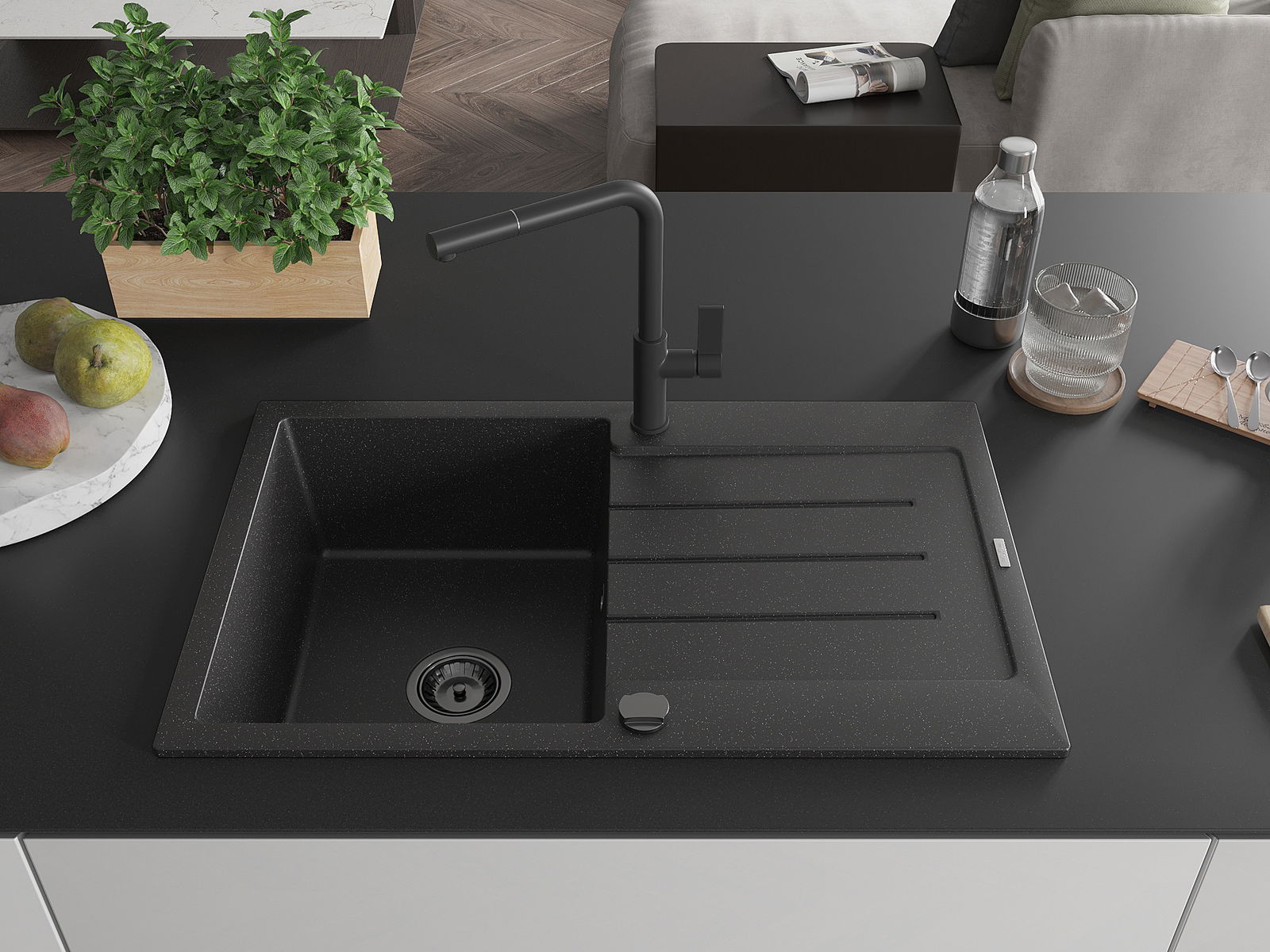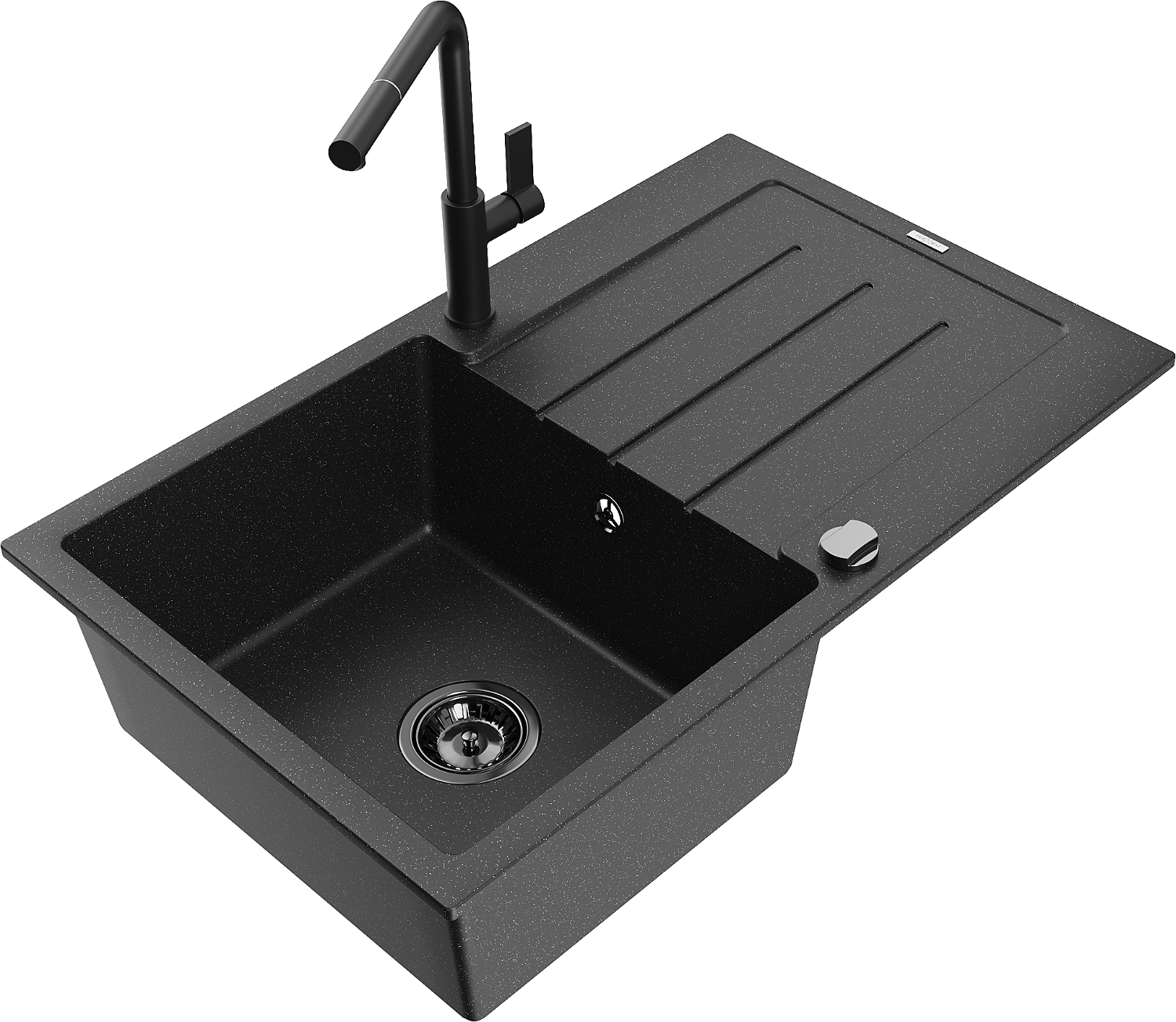 Mexen Bruno chiuvetă de granit cu o singură cuvă, cu scurgător și baterie de bucătărie Flora, negru/argintiu metalizat