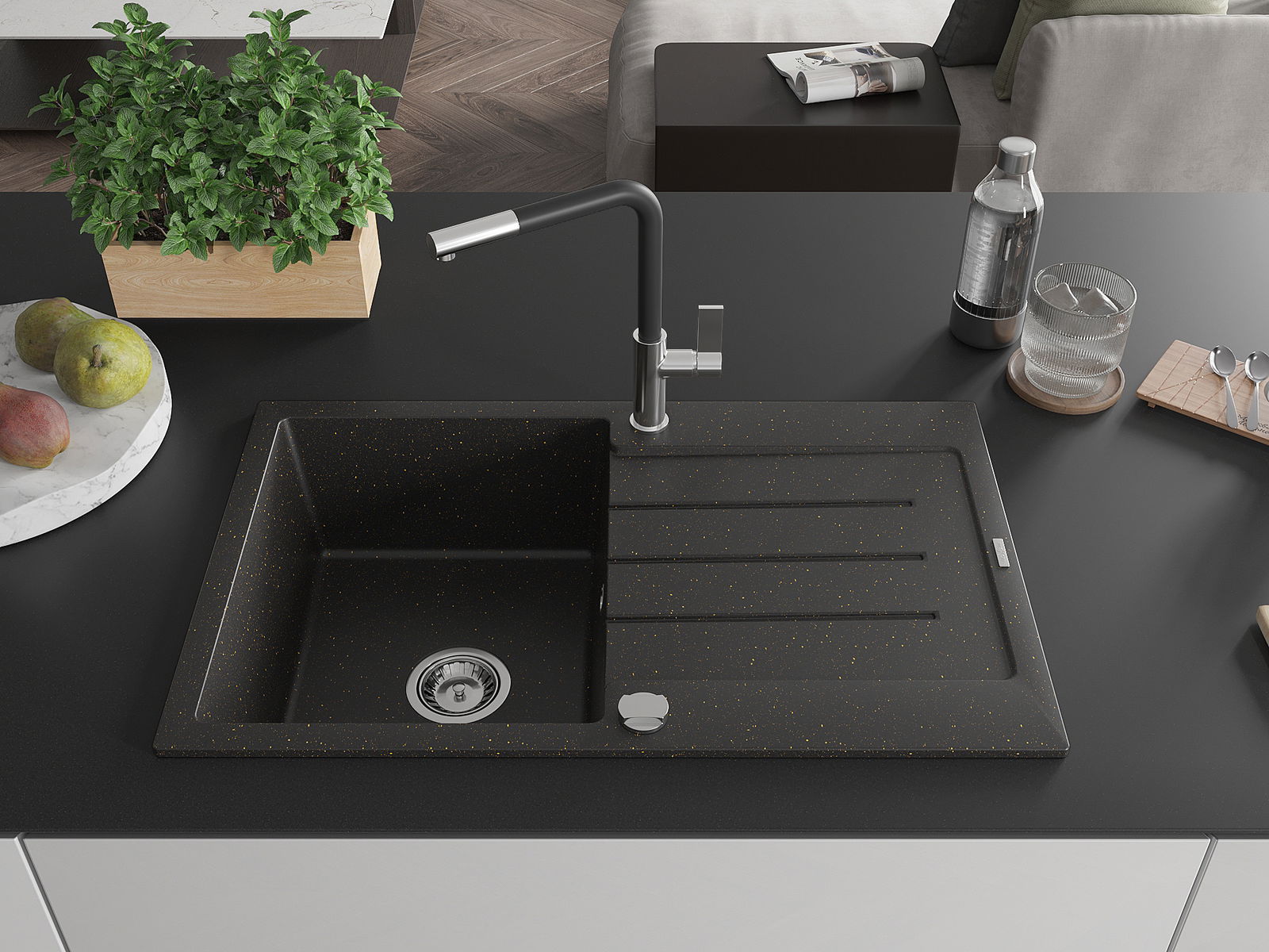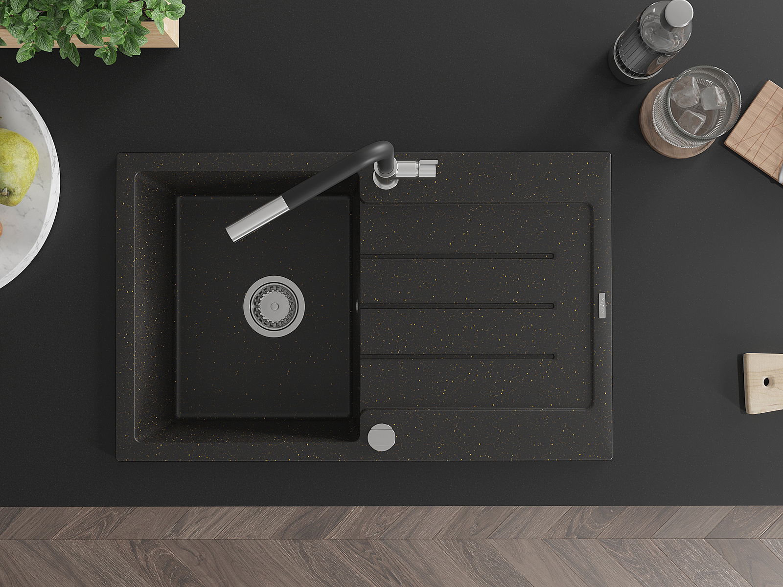 Mexen Bruno chiuvetă de granit cu 1 compartiment și scurgător, cu baterie de bucătărie Flora, negru/auriu metalic