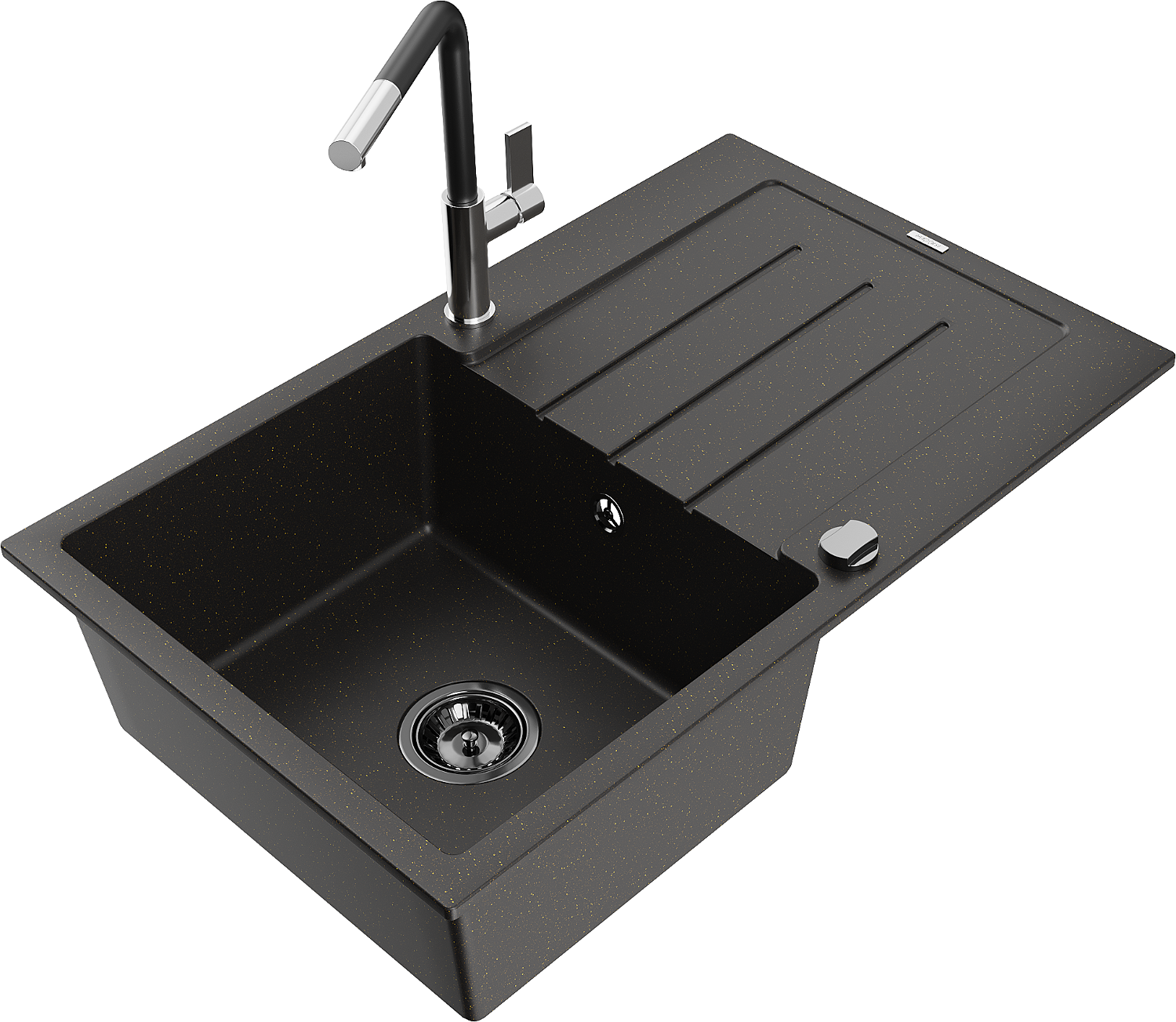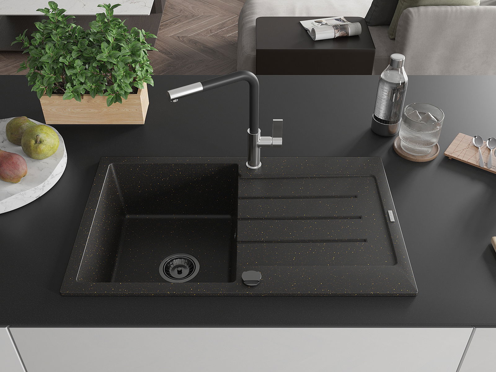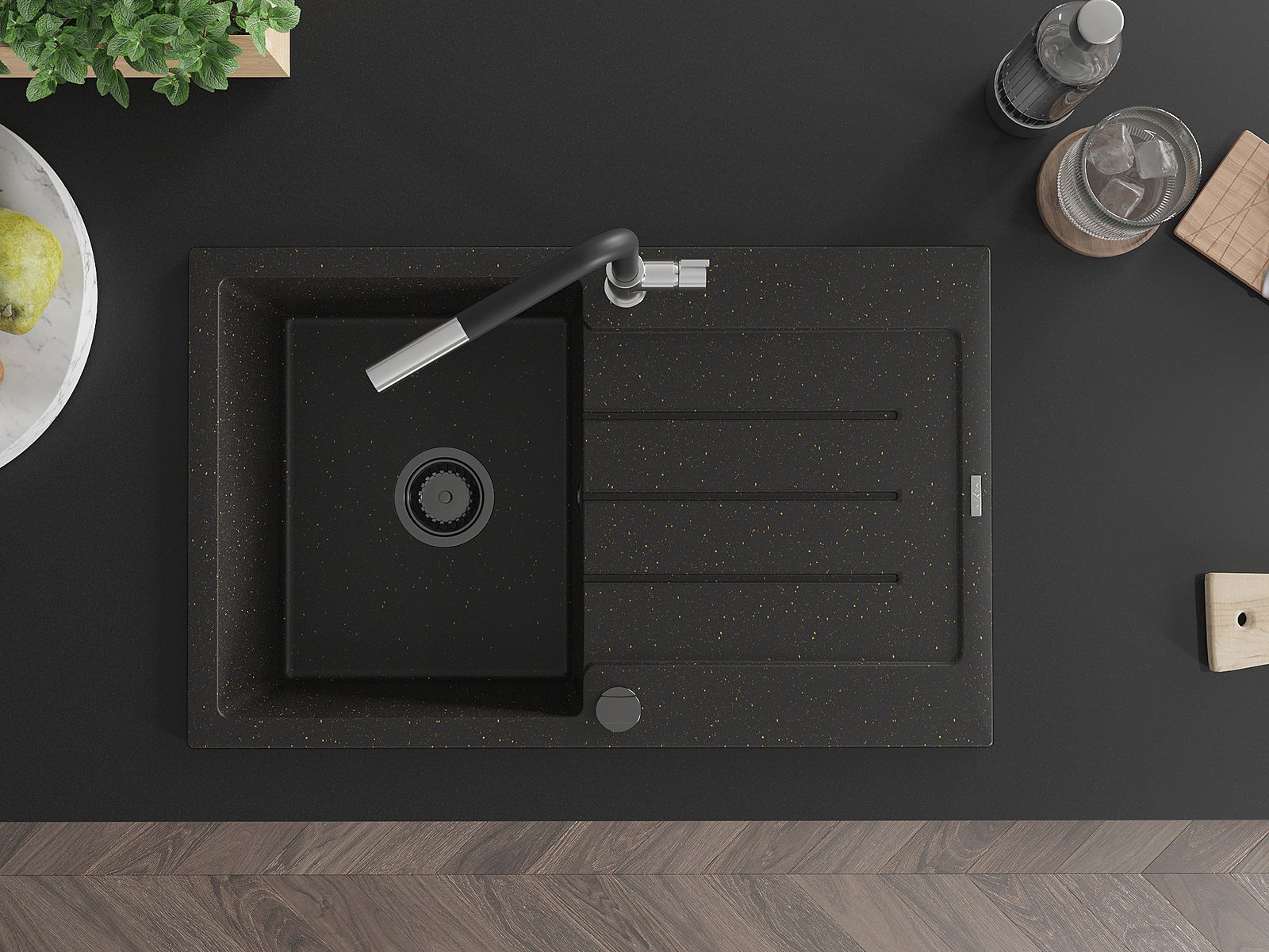 Mexen Bruno chiuvetă de granit cu 1 compartiment cu scurgător și baterie de bucătărie Flora, negru/auriu metalizat