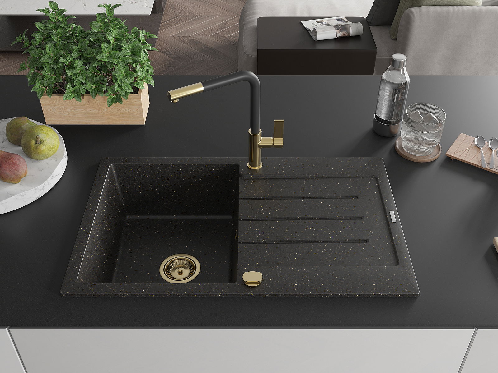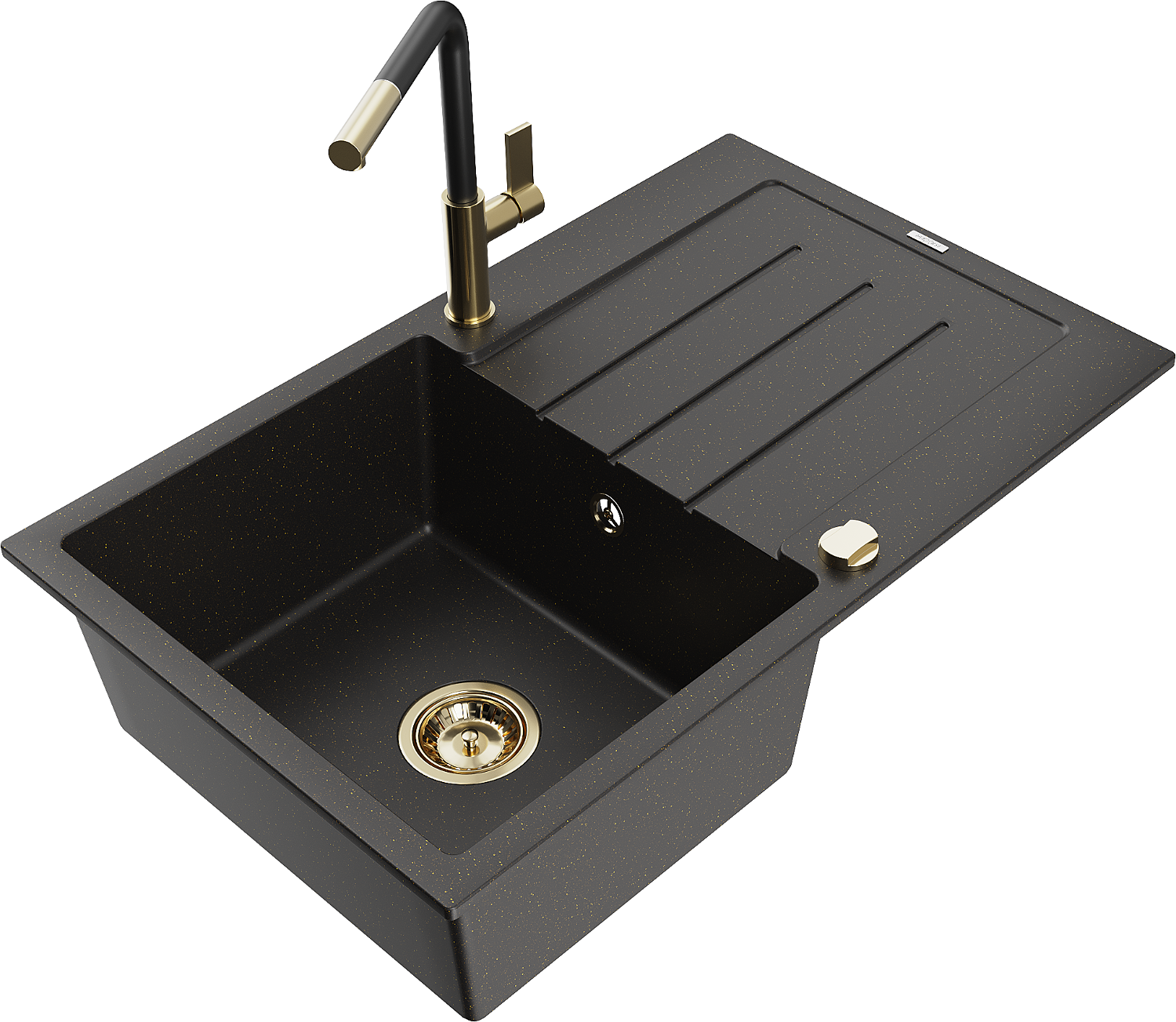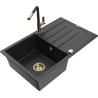 Mexen Bruno chiuvetă de granit cu 1 compartiment cu scurgător și baterie de bucătărie Flora, negru/auriu metalic