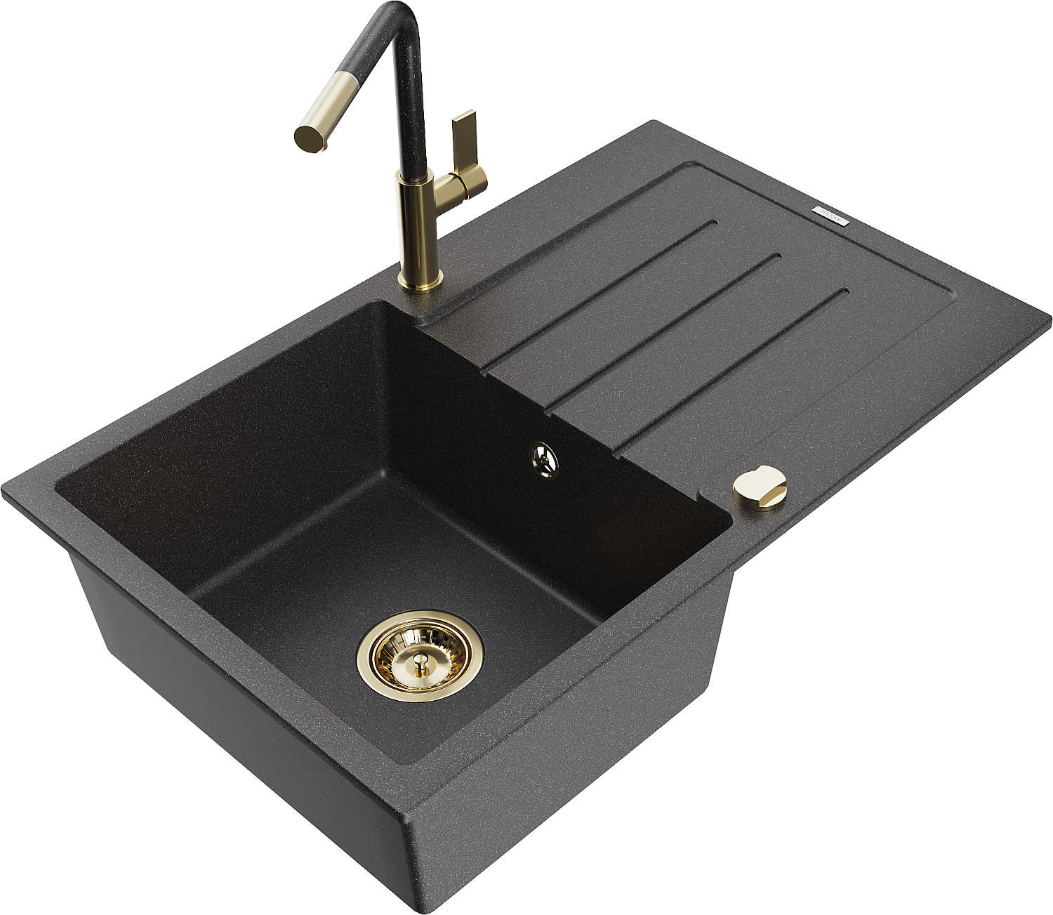 Mexen Bruno chiuvetă de granit cu 1 compartiment cu scurgător și baterie de bucătărie Flora, neagru cu pete
