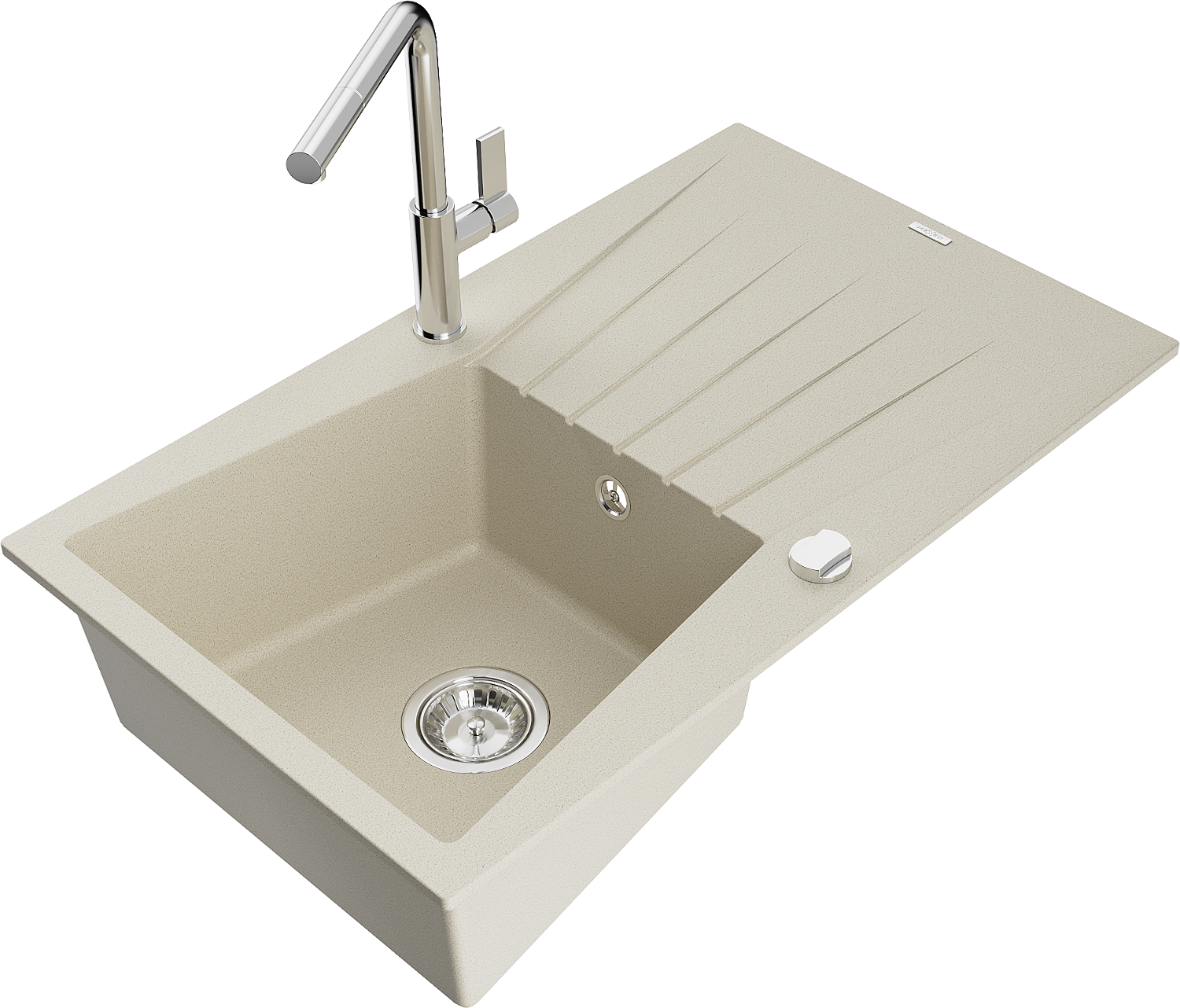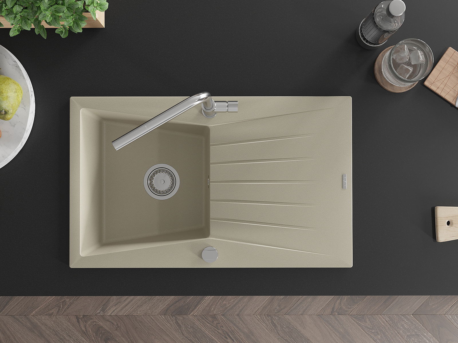 Mexen Cesar chiuvetă de granit cu 1 compartiment și scurgător, cu baterie de bucătărie Flora, bej - 6514-69-670401-00