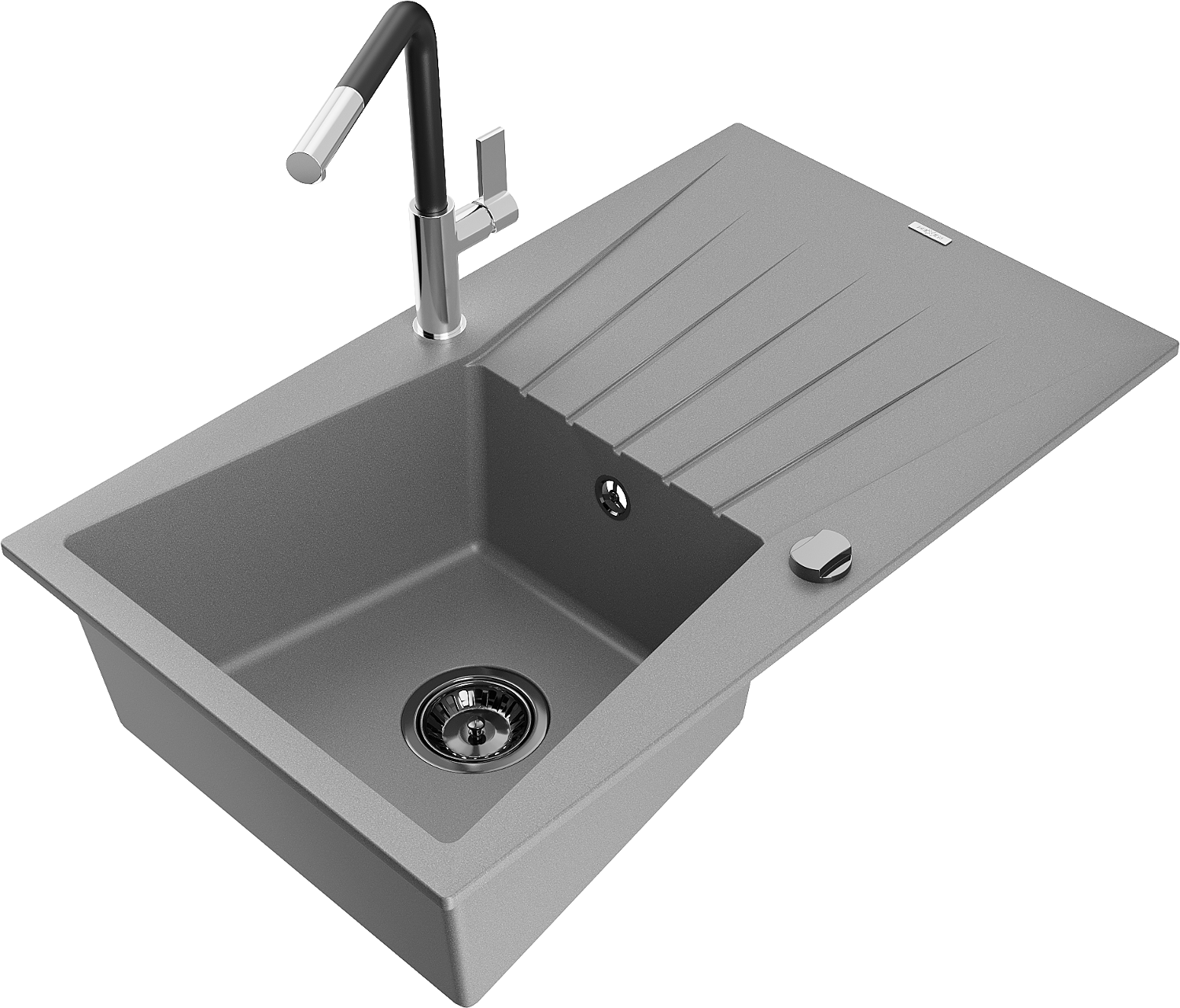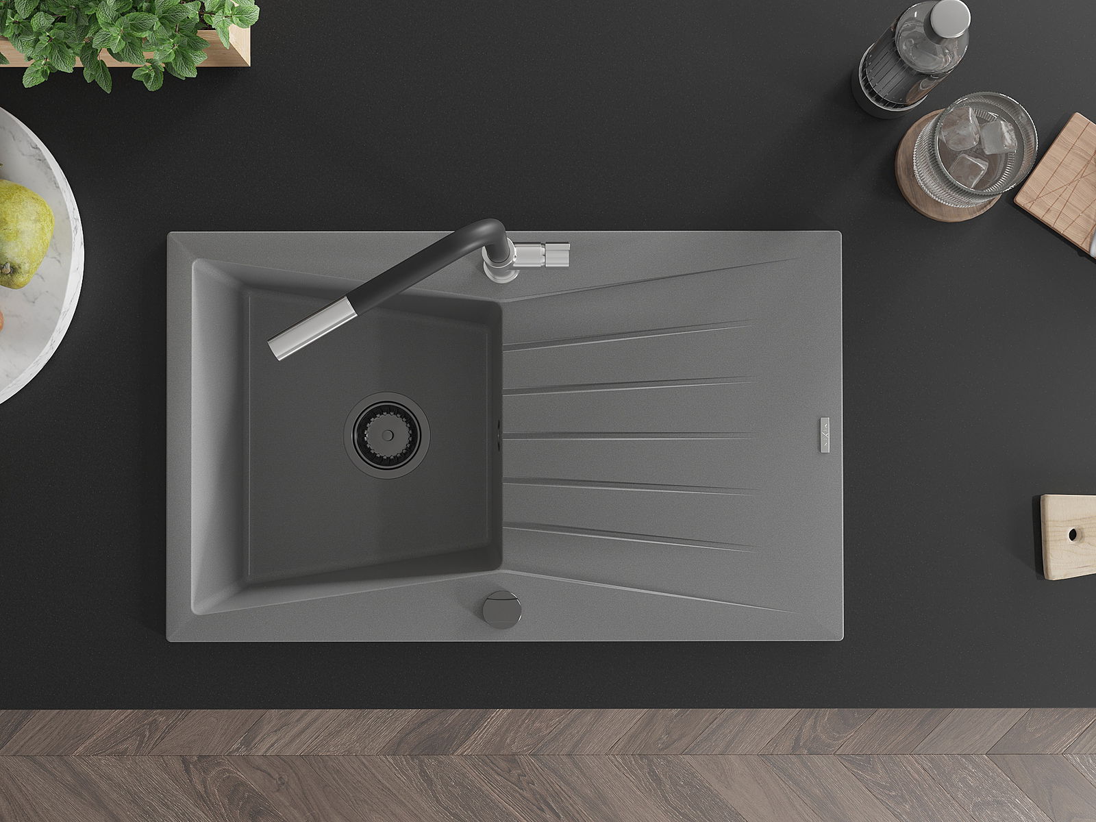 Mexen Cesar chiuvetă de bucătărie din granit cu 1 compartiment și drenaj și baterie Flora, gri - 6514-71-670401-07-B