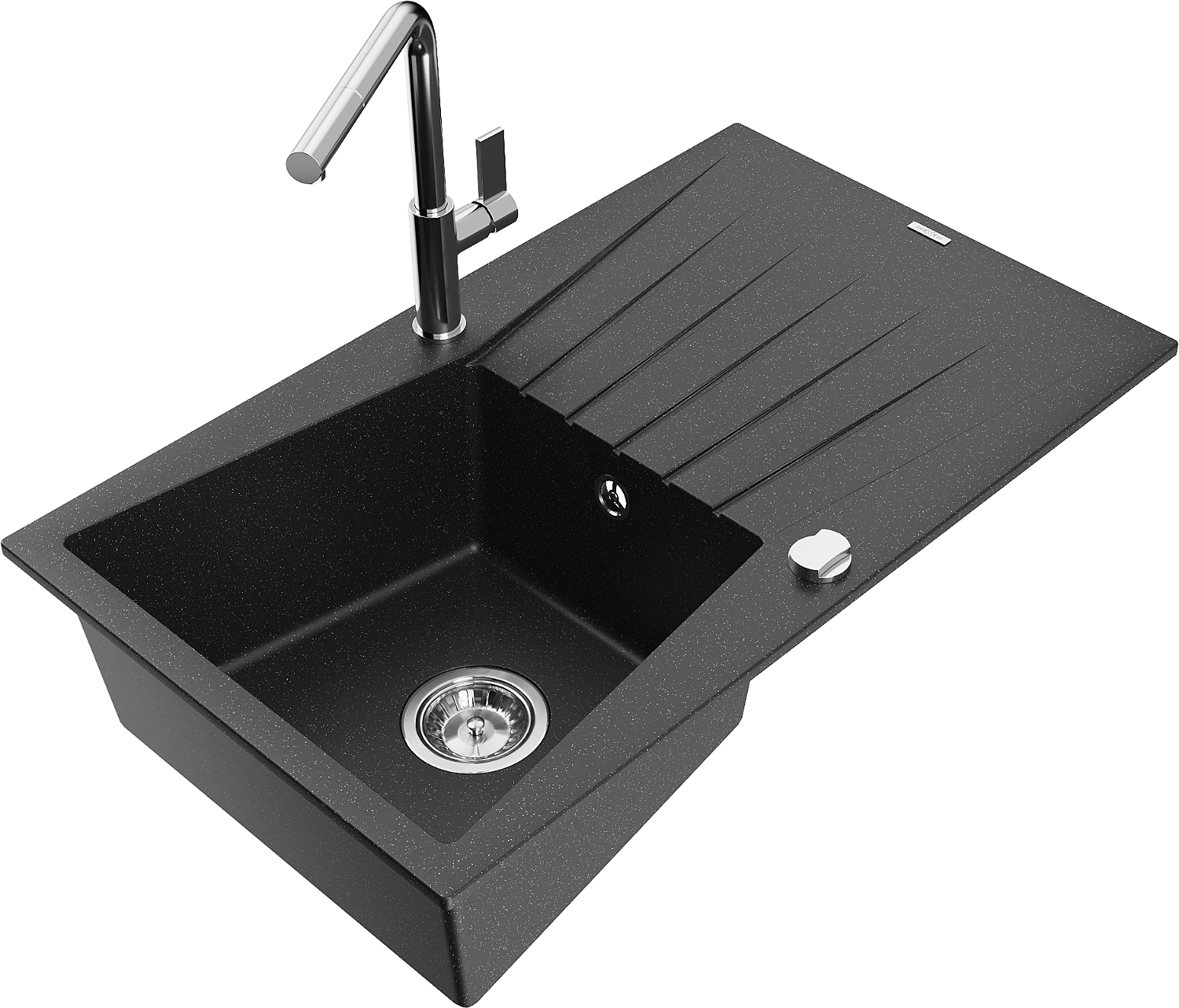 Mexen Cesar chiuvetă de granit cu 1 compartiment cu scurgător și baterie de bucătărie Flora, negru/metalic argintiu
