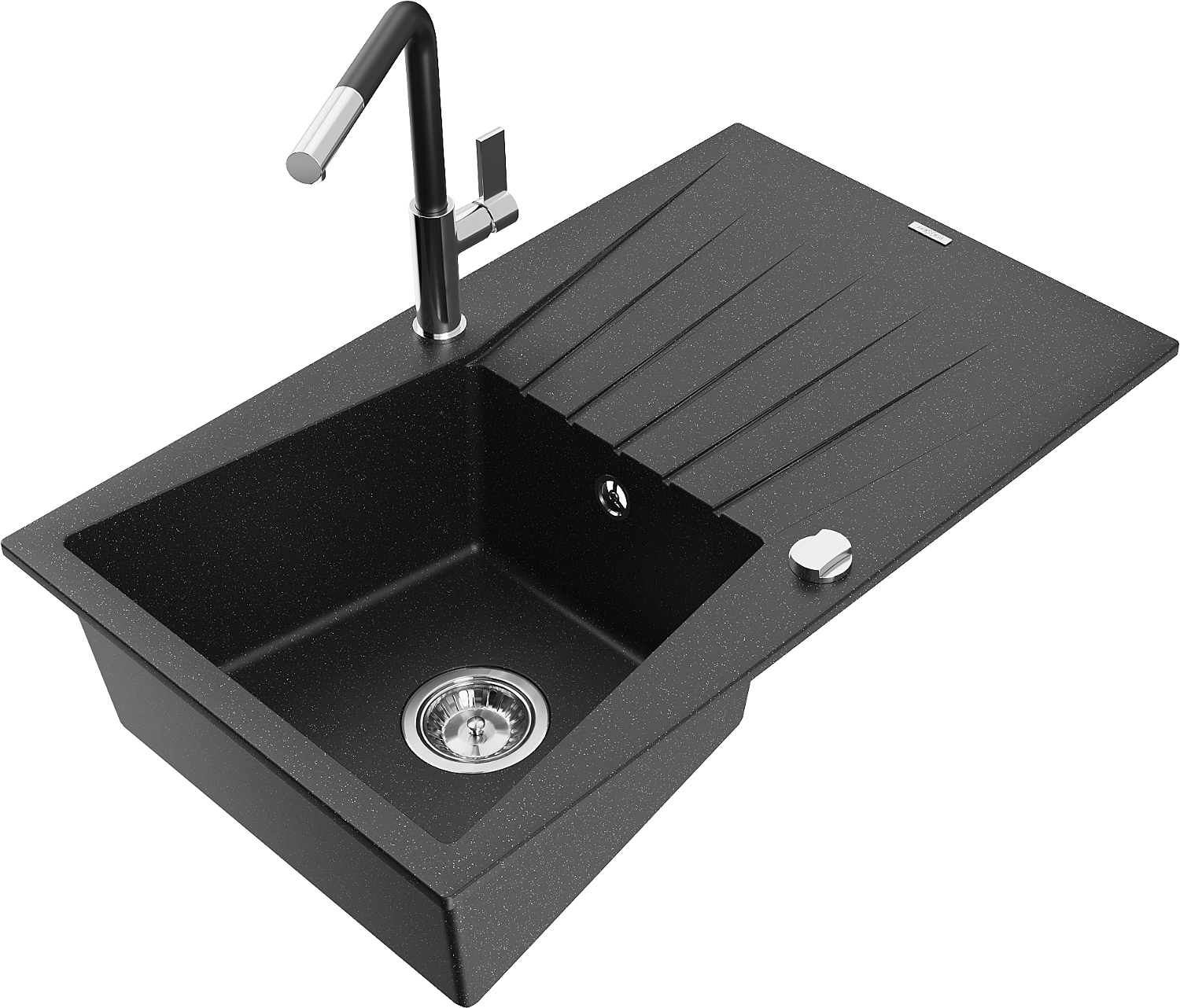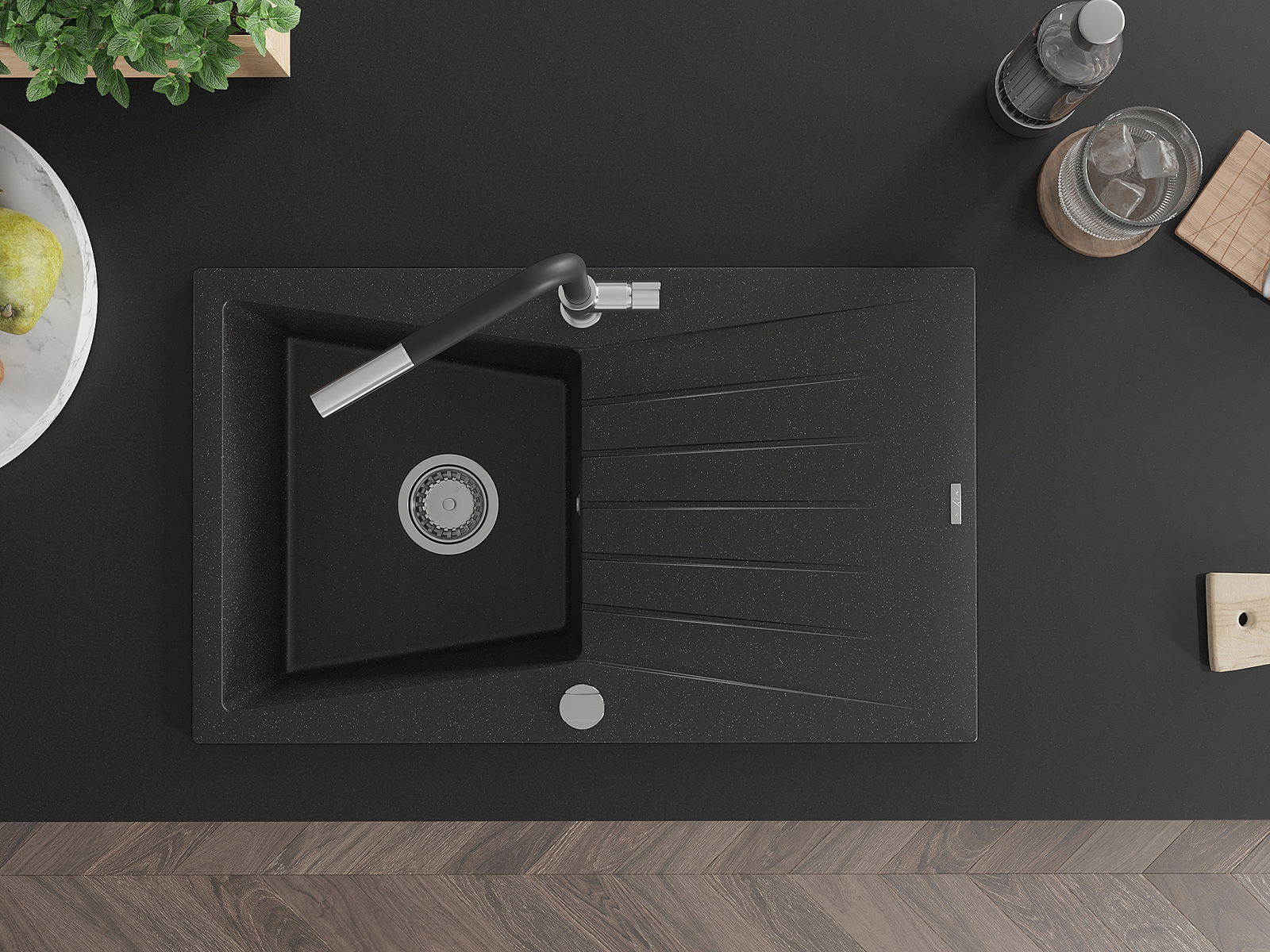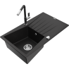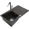 Mexen Cesar chiuvetă de bucătărie din granit cu 1 compartiment, cu scurgător și baterie Flora, negru/argintiu metalic