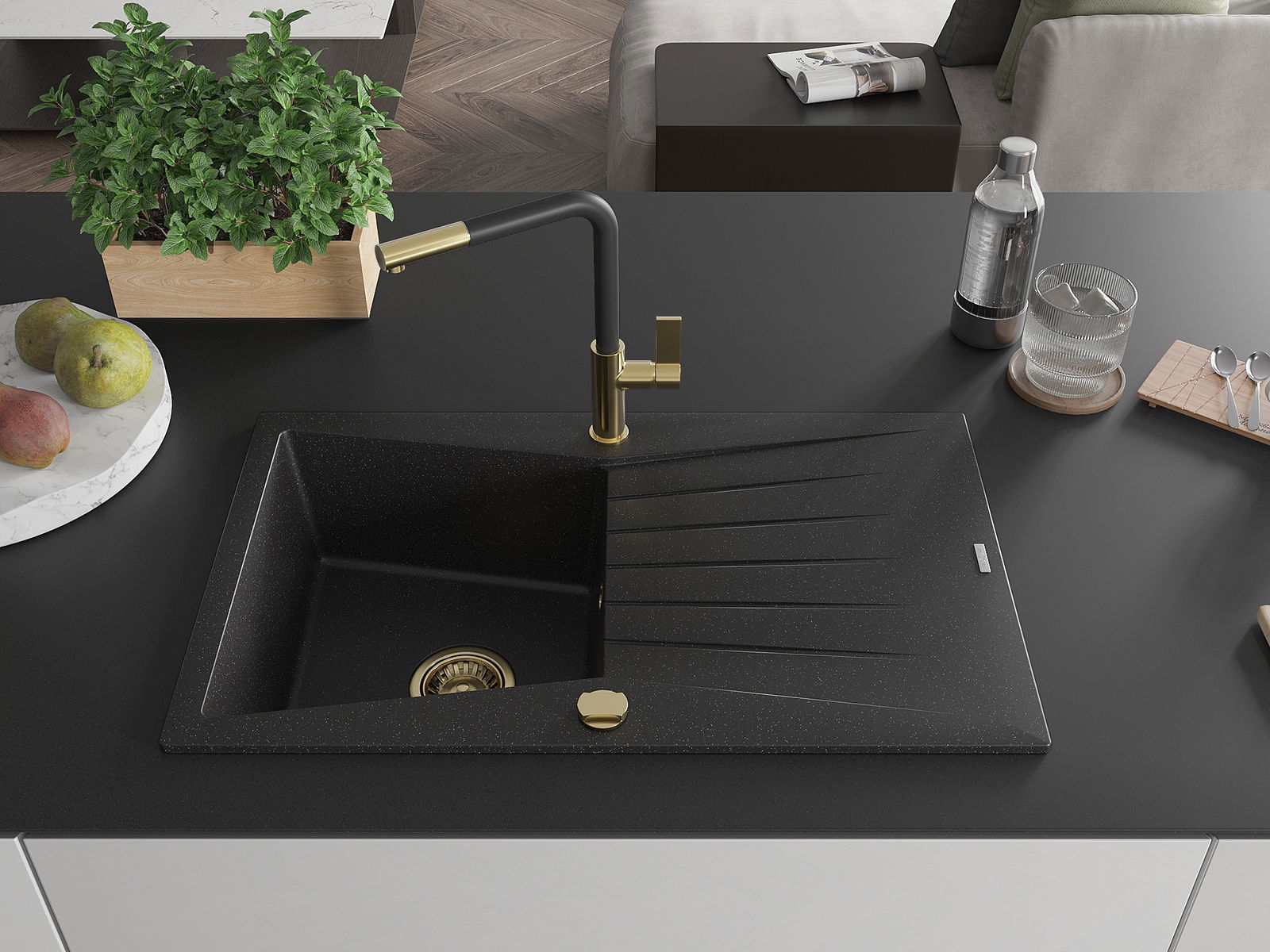 Mexen Cesar chiuvetă de granit cu o cuvă cu scurgător și baterie de bucătărie Flora, negru/argintiu metalizat