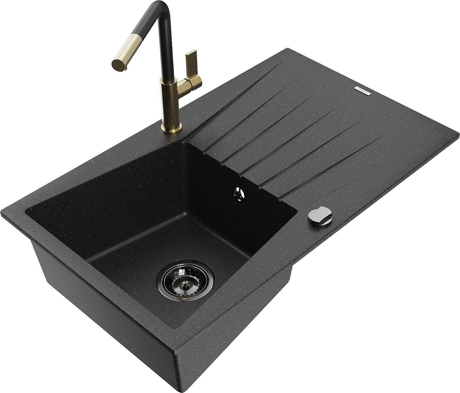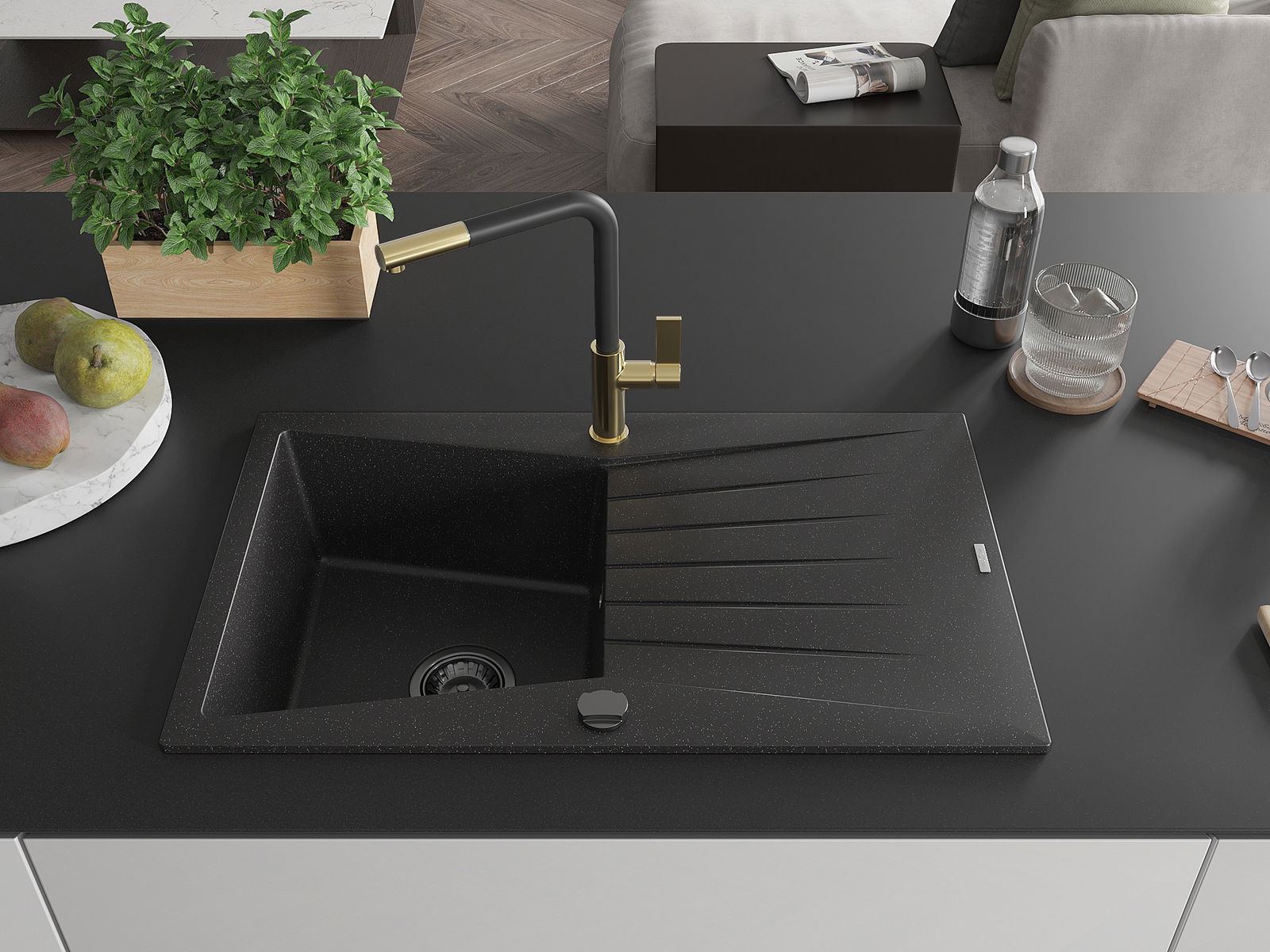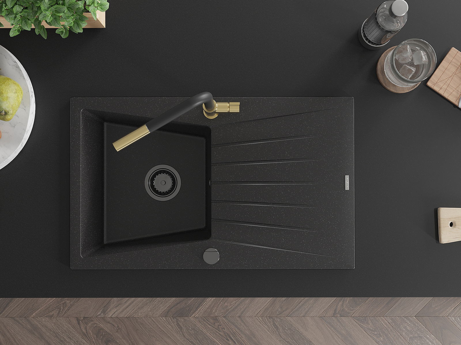 Mexen Cesar chiuvetă de bucătărie din granit cu 1 compartiment, cu picurător și baterie Flora, negru/argintiu metalic