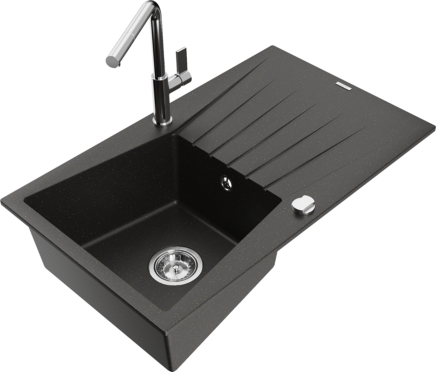 Mexen Cesar chiuvetă de bucătărie din granit cu o singură cuvă și picurător și baterie Flora, negru/auriu metalic - 6514-75-670?