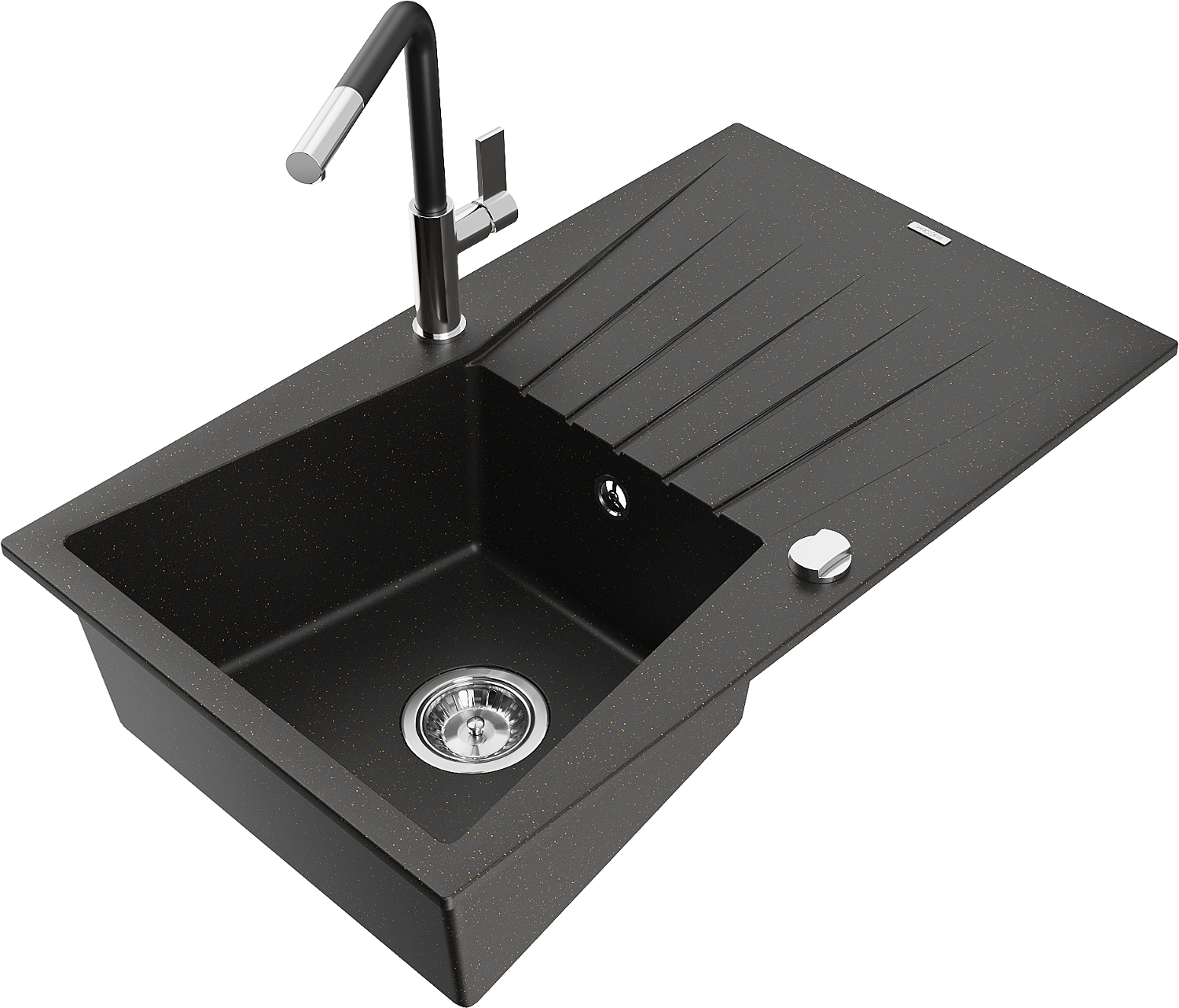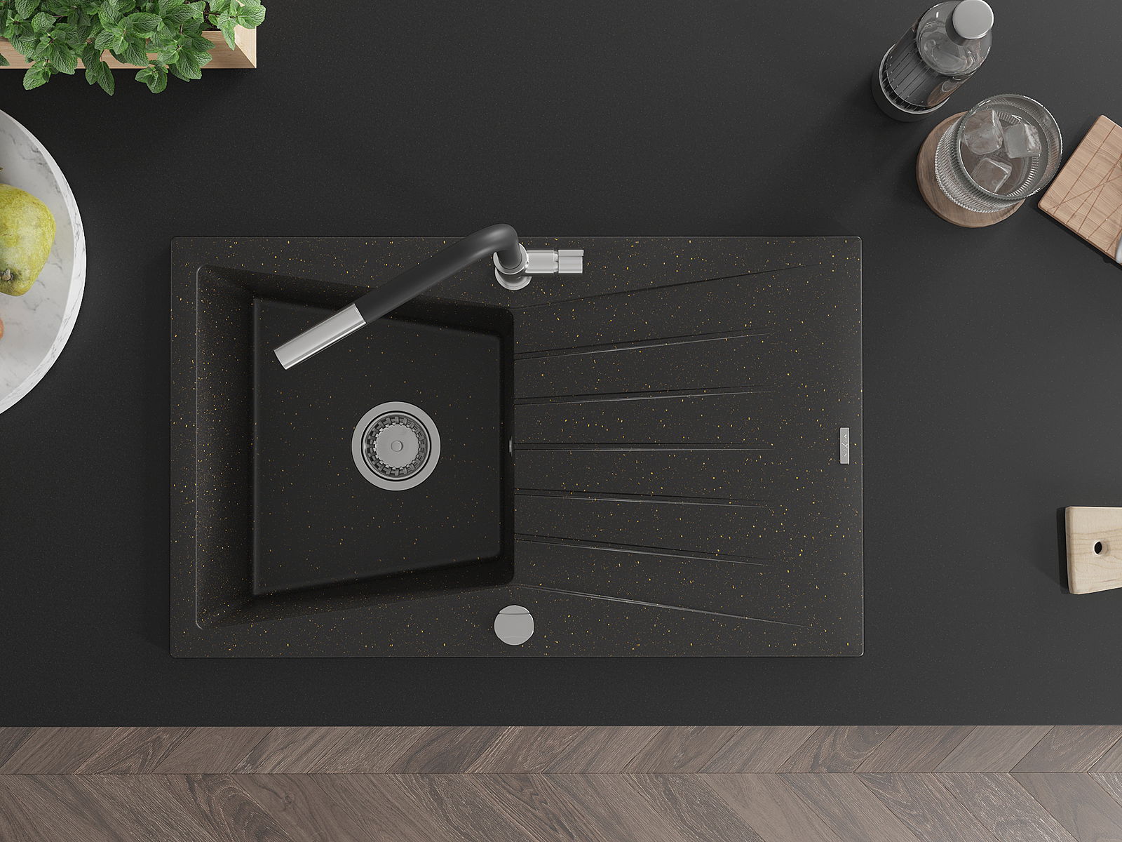 Mexen Cesar chiuvetă de granit cu 1 compartiment cu scurgător și baterie de bucătărie Flora, negru/auriu metalic