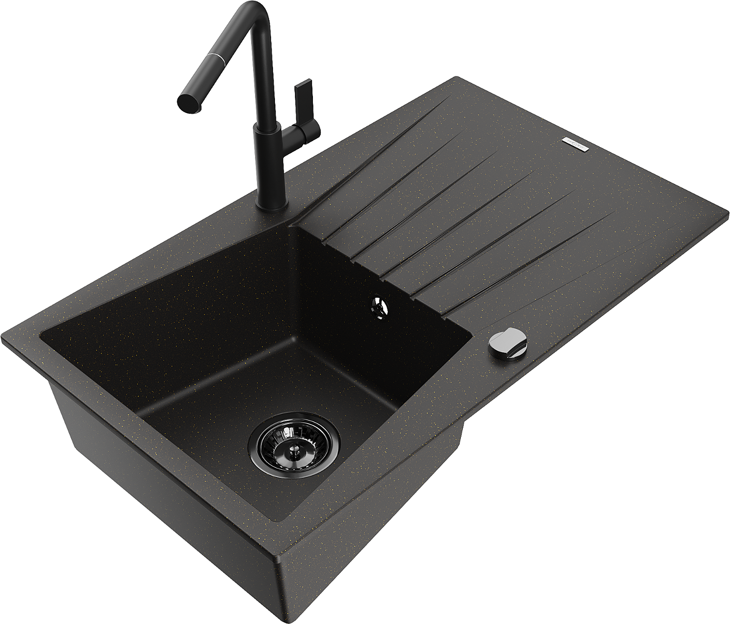 Mexen Cesar chiuvetă din granit cu 1 compartiment cu scurgător și baterie de bucătărie Flora, negru/auriu metalic