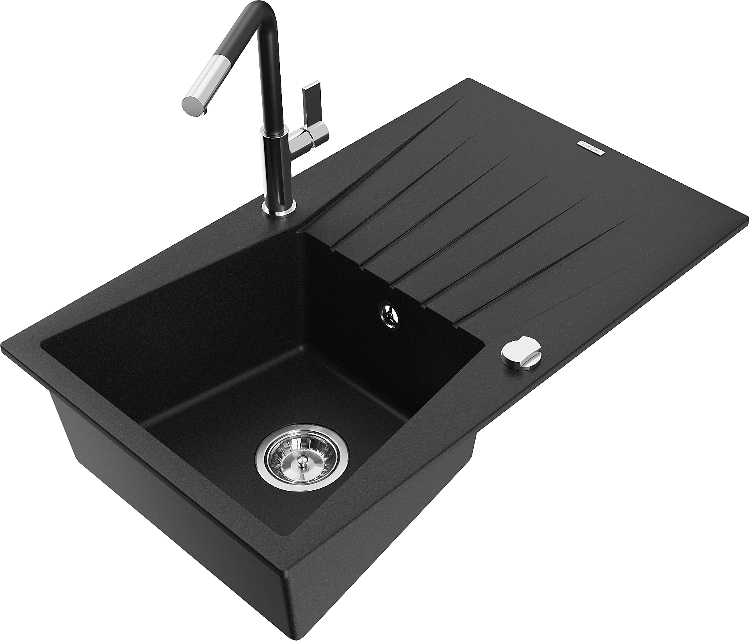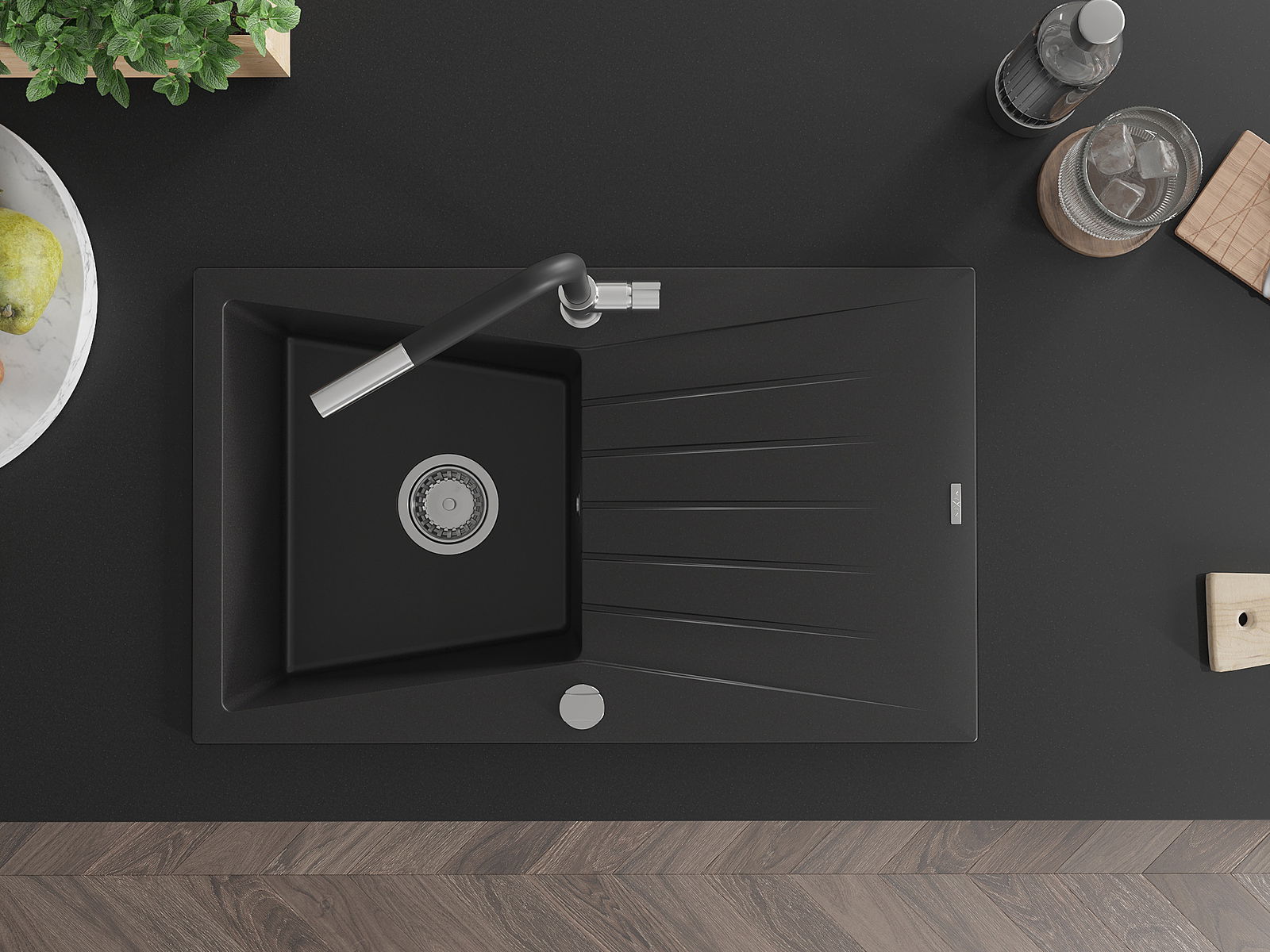 Mexen Cesar chiuvetă de bucătărie din granit cu 1 cuvă și picurător și baterie Flora, negru - 6514-77-670401-07