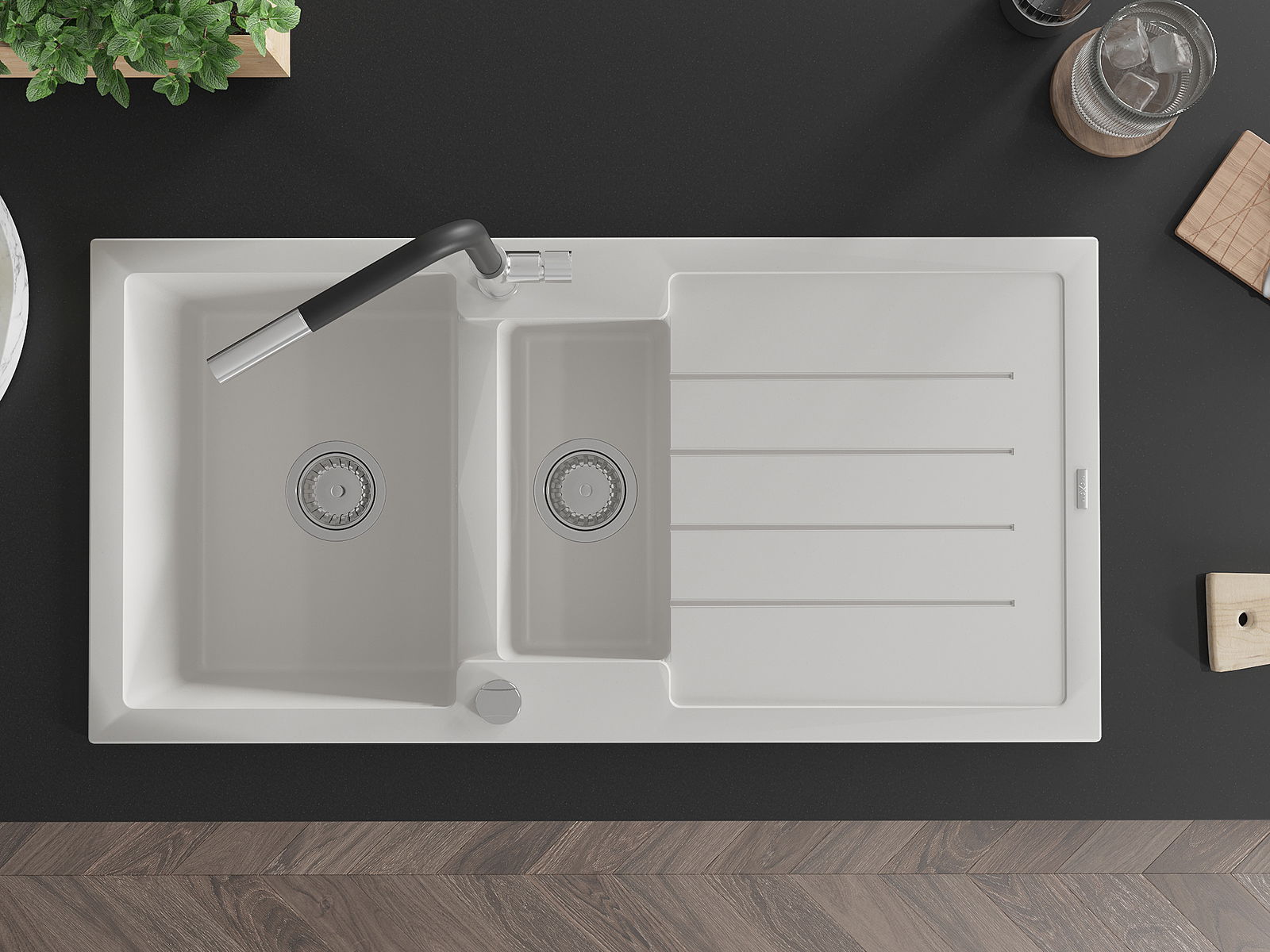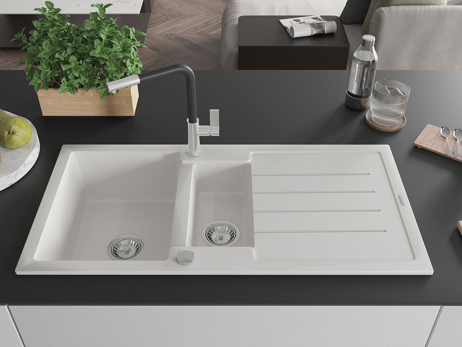 Suprafața chiuvetei este rezistentă la pete și decolorare, ceea ce o face ușor de întreținut și își păstrează culoarea pentru o perioadă lungă de utilizare. Un complet estetic și practic pentru orice bucătărie.