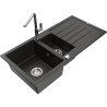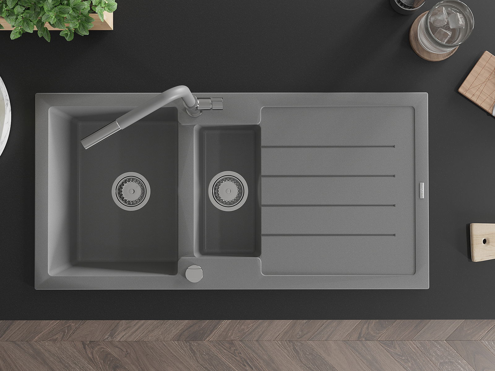 Mexen Andres chiuvetă de granit cu 1,5 cuve, cu scurgător și baterie de bucătărie Flora, gri - 6515-71-670401-06