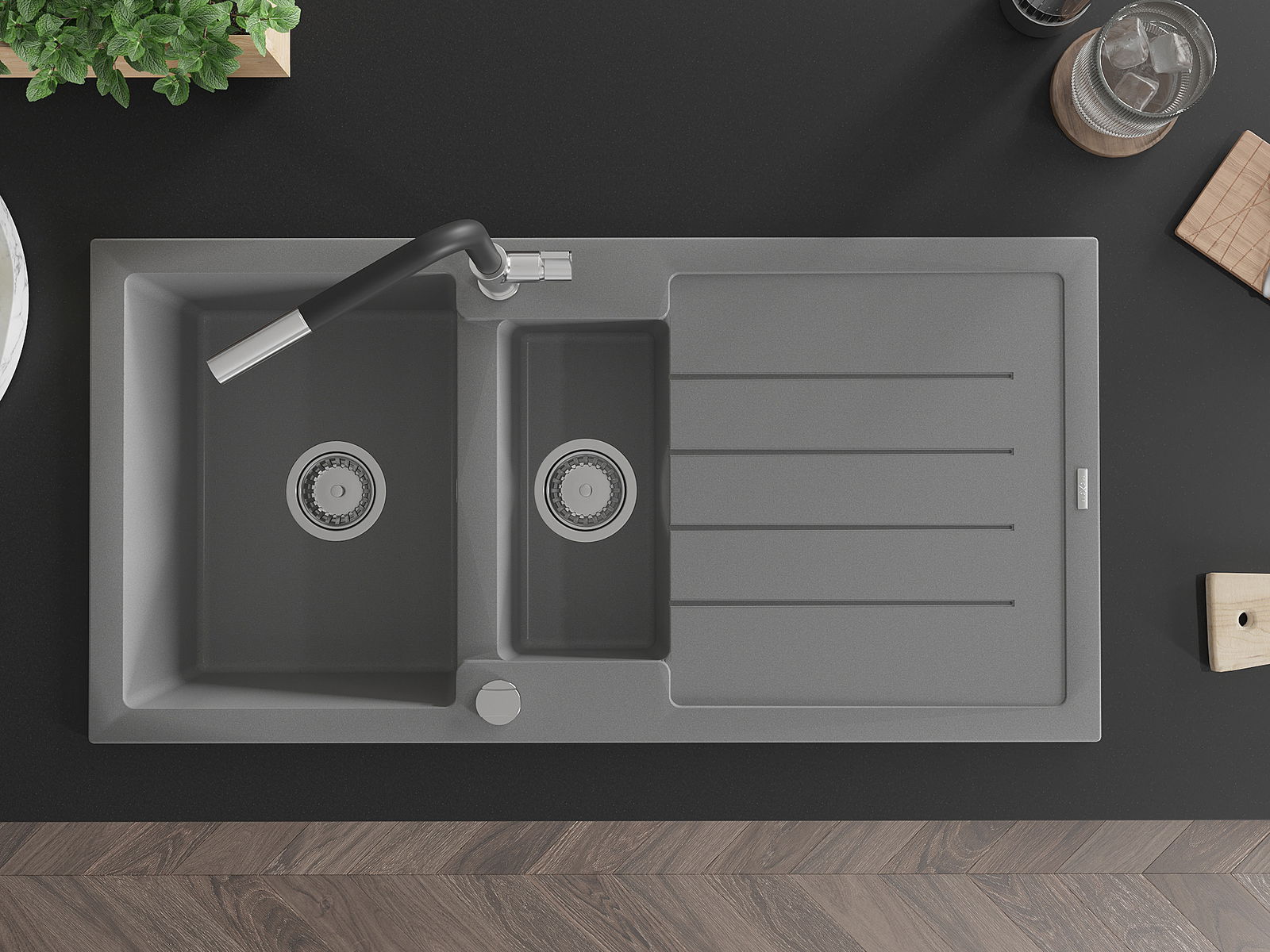 Mexen Andres chiuvetă granit 1,5-camere cu scurgător și baterie bucătărie Flora, gri - 6515-71-670401-07