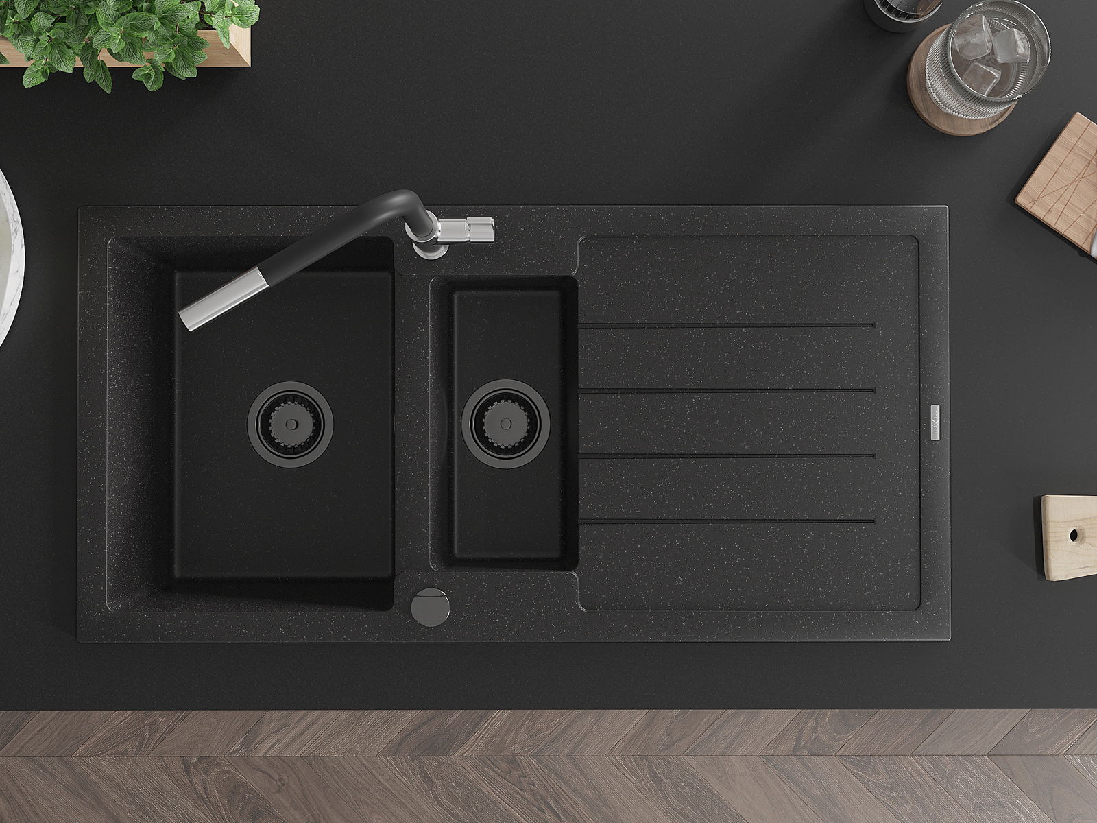 Mexen Andres chiuvetă de granit cu 1,5 compartimente cu scurgător și baterie de bucătărie Flora, neagră/argintie