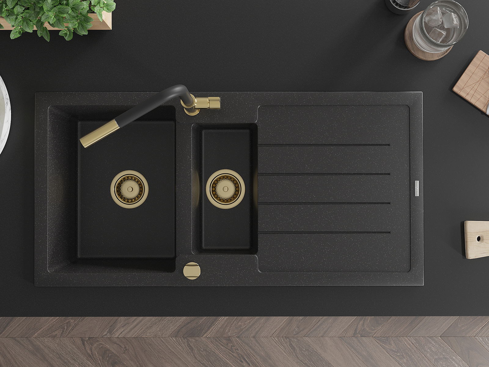 Chiuveta are 2 orificii frezate de 35 mm în diametru, care pot fi perforate manual. Acestea pot fi utilizate, printre altele, pentru instalarea unui dozator de detergent, care va elimina prezența sticlelor de plastic din bucătărie și va oferi un finisaj elegant.
